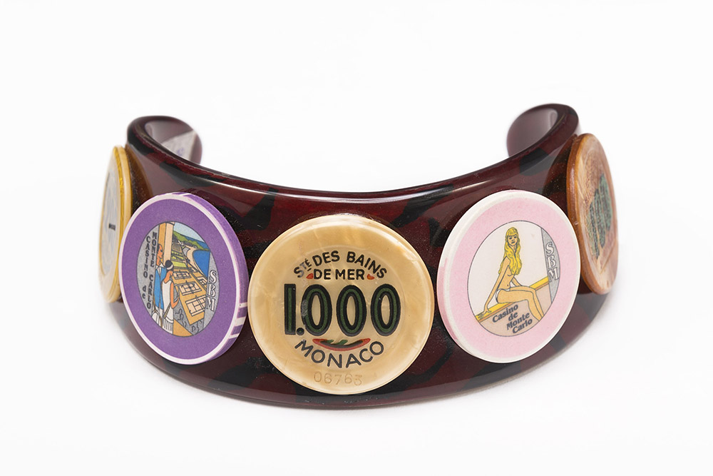 BELLINI Collier de chien rigido in galalite a ricordare la tartaruga con cinque vecchie fiches della SociÈtÈ des Bains de Mer - Casino di Monte Carlo