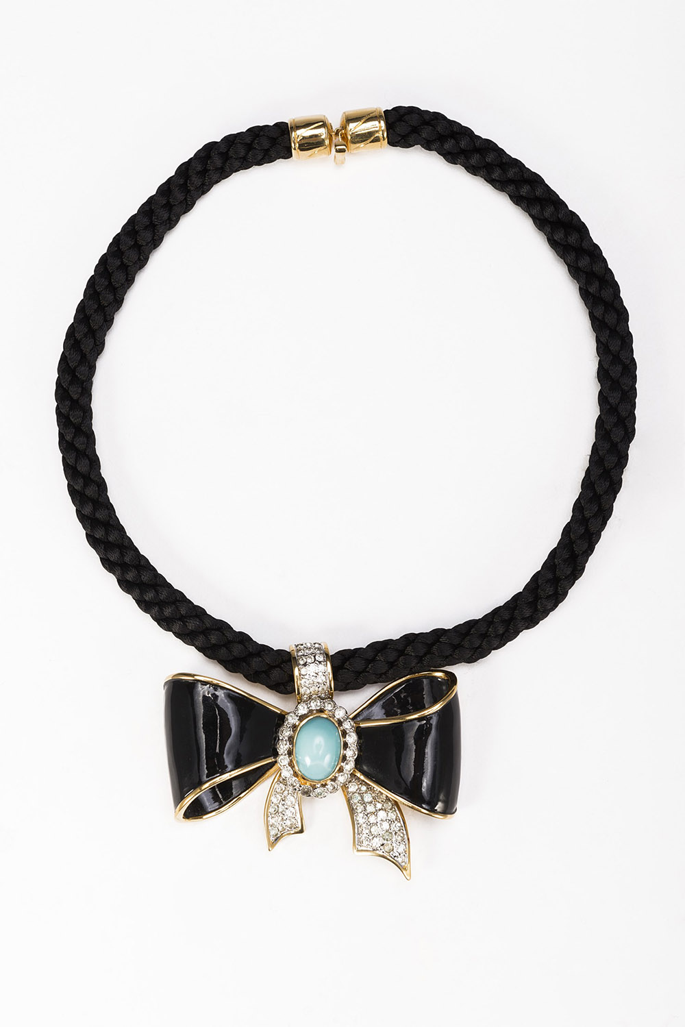 VALENTINO Collier in cotone intrecciato nero con pendente centrale a forma di fiocco in smalto, strass e turchese cabochon
