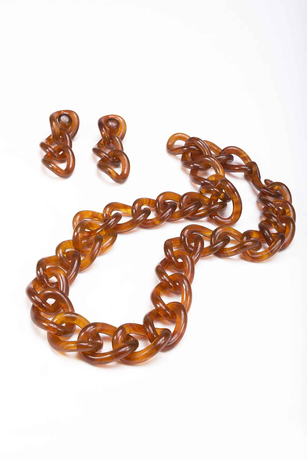 Demi-parure in materiale plastica color tartaruga composto da lunga collana e orecchini a catena