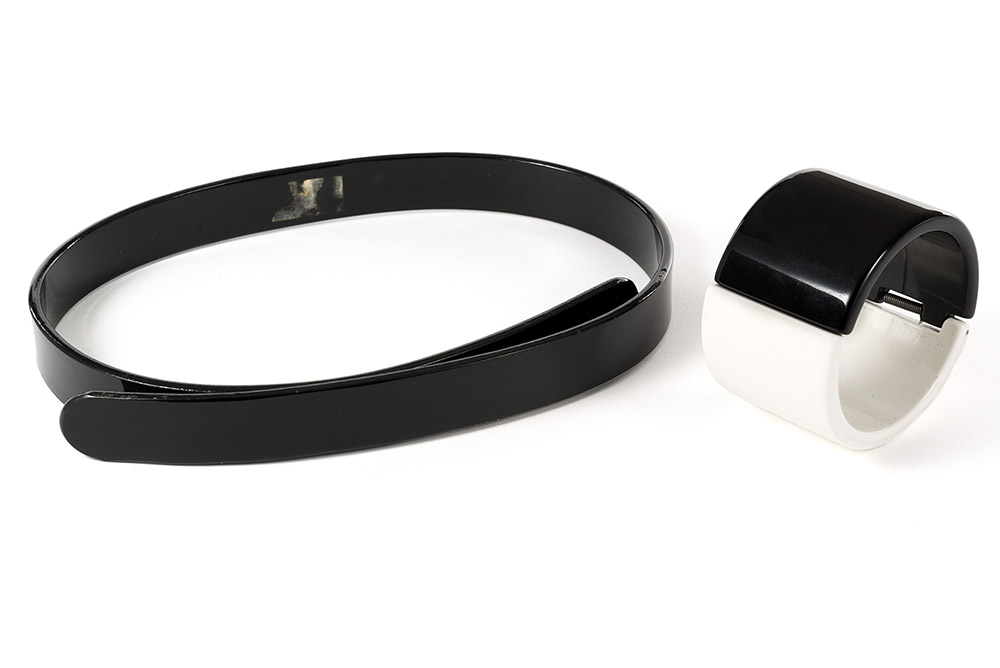 Bracciale rigido con apertura a molla in bachelite bianca e nera, h cm 5 unita ad una cintura pendant rigida