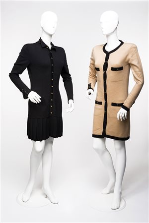 CHANEL Lotto di due vestiti in maglia di lana, uno nocciola profilato in nero con bottoni gioiello, l'altro nero con balza a pieghe sul fondo e bottoni gioiello logati (mancanze (tg I 42/44)