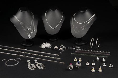 LOTTO DI ARGENTO 925/000 COMPOSTO DA: * quattro catenine con strass incolore centrale e un sautoir con straa a fiorellino * paio di anelle con strass *cinque coliers varie lunghezze con strass incolori * sei anelli con strass incolori e pietre fancy colorate * due braccialetti con strass incolori * sette paia di orecchini in strass incolori e pietre fancy colorate * due tennis in pietre fancy colorate argento 800