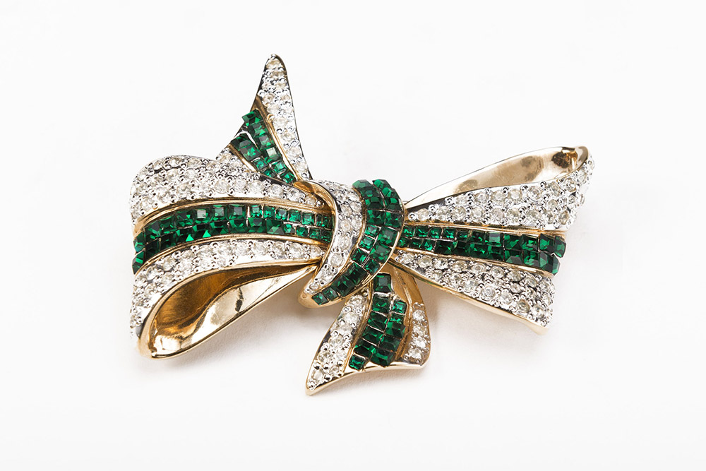VOGUE BIJOUX Grande spilla a forma di fiocco in metallo color oro con strass verdi e incolori