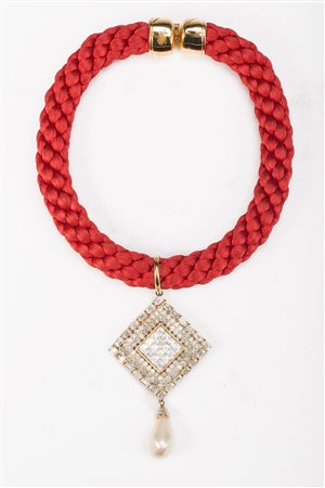 VALENTINO Collier in cotone intrecciato rosso rifinito in metallo color oro con pendente centrale in strass e perla fancy a goccia
