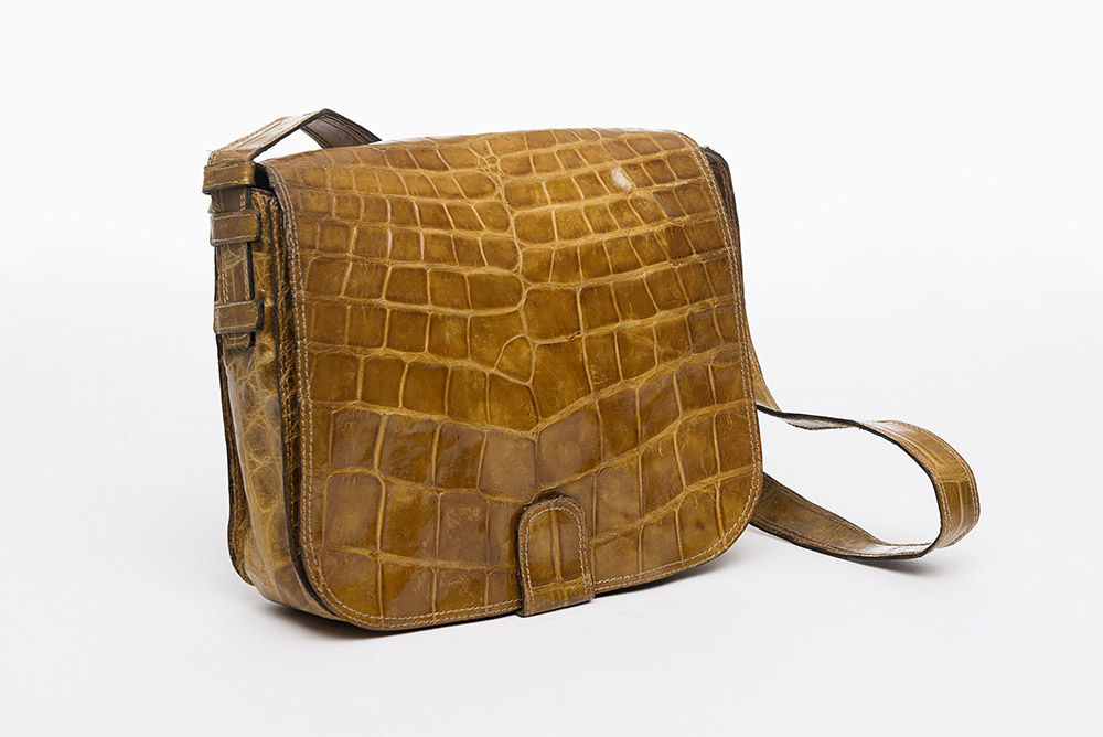 Borsa a tracolla in coccodrillo color miele, largh. cm 26.5. Pre-Convenzione Cites (lievi difetti)
