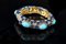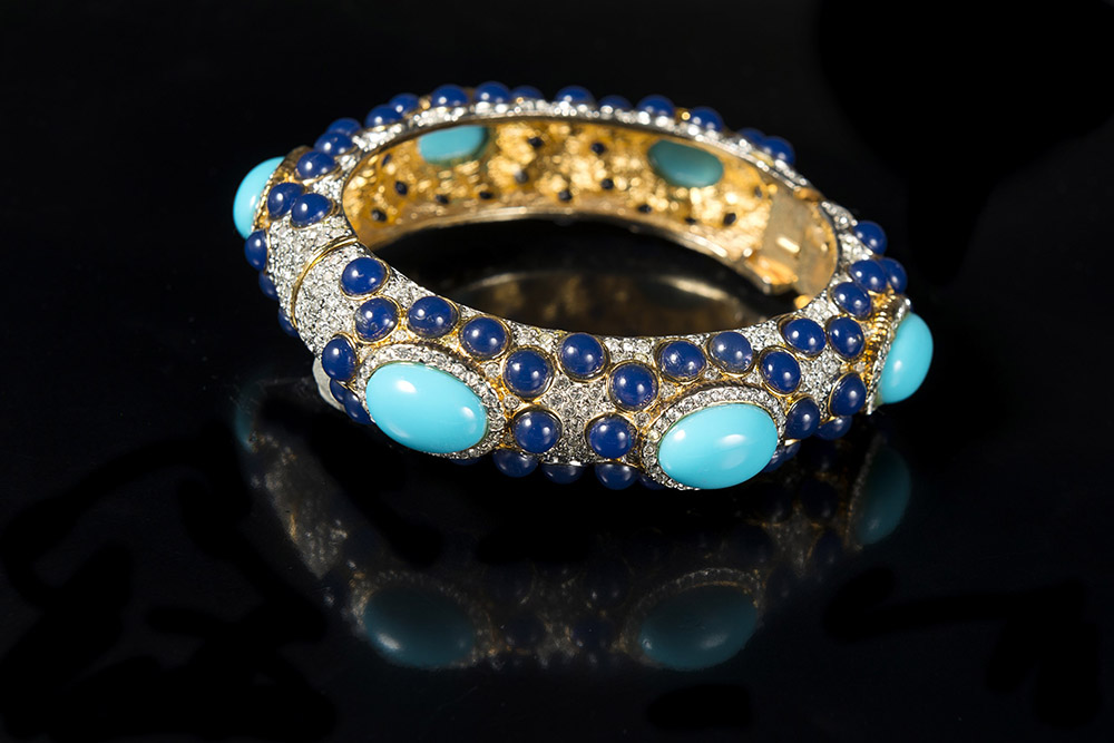 KENETH LANE Bracciale rigido con apertura a scatto in metallo color oro , strass incolori e cabochon color turchese e blu, sacchetto e scatola originali