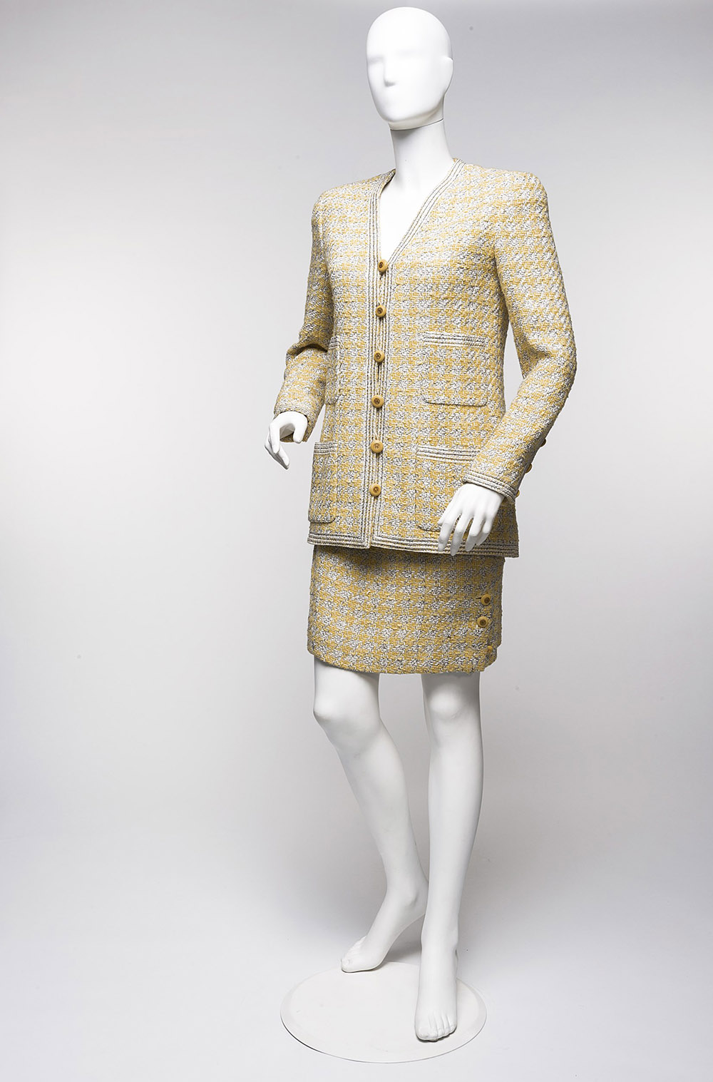 CHANEL BOUTIQUE Tailleur in bouclÈ di lana sui toni del giallo, bianco e nero. Bottoni gioiello giallo e oro. Tg. 38 (lievi difetti nella gonna)