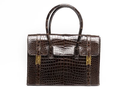 HERMES PARIS Borsa "Drag bag" a doppio manico in coccodrillo testa di moro con doppia chiusura logata in metallo dorato. 1964 (pre-Cites). cm 29,5 (lievi difetti)