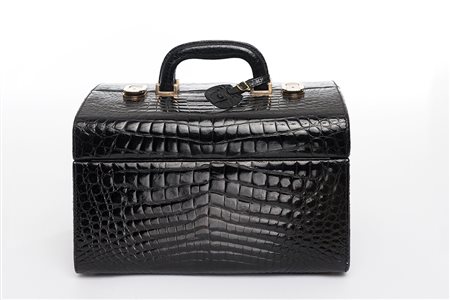 Bauletto in coccodrillo color nero bombato, doppio manico, rifiniture in ottone dorato, satinato e lucido, cm 35x23x21. Modello attribuito a Valigeria Napoleon (Milano, Via Montenapoleone 25). Pre-Convenzione Cites