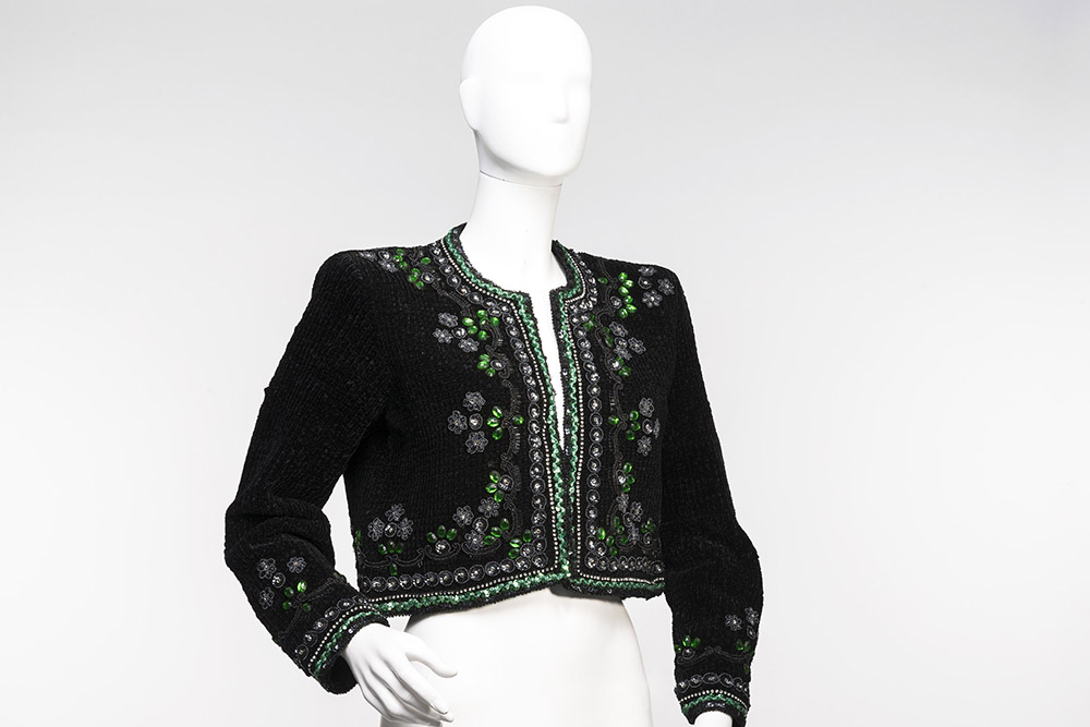 Giacchino in maglia di ciniglia nero con ricami in pailletes, canottiglie e strass verdi e incolori