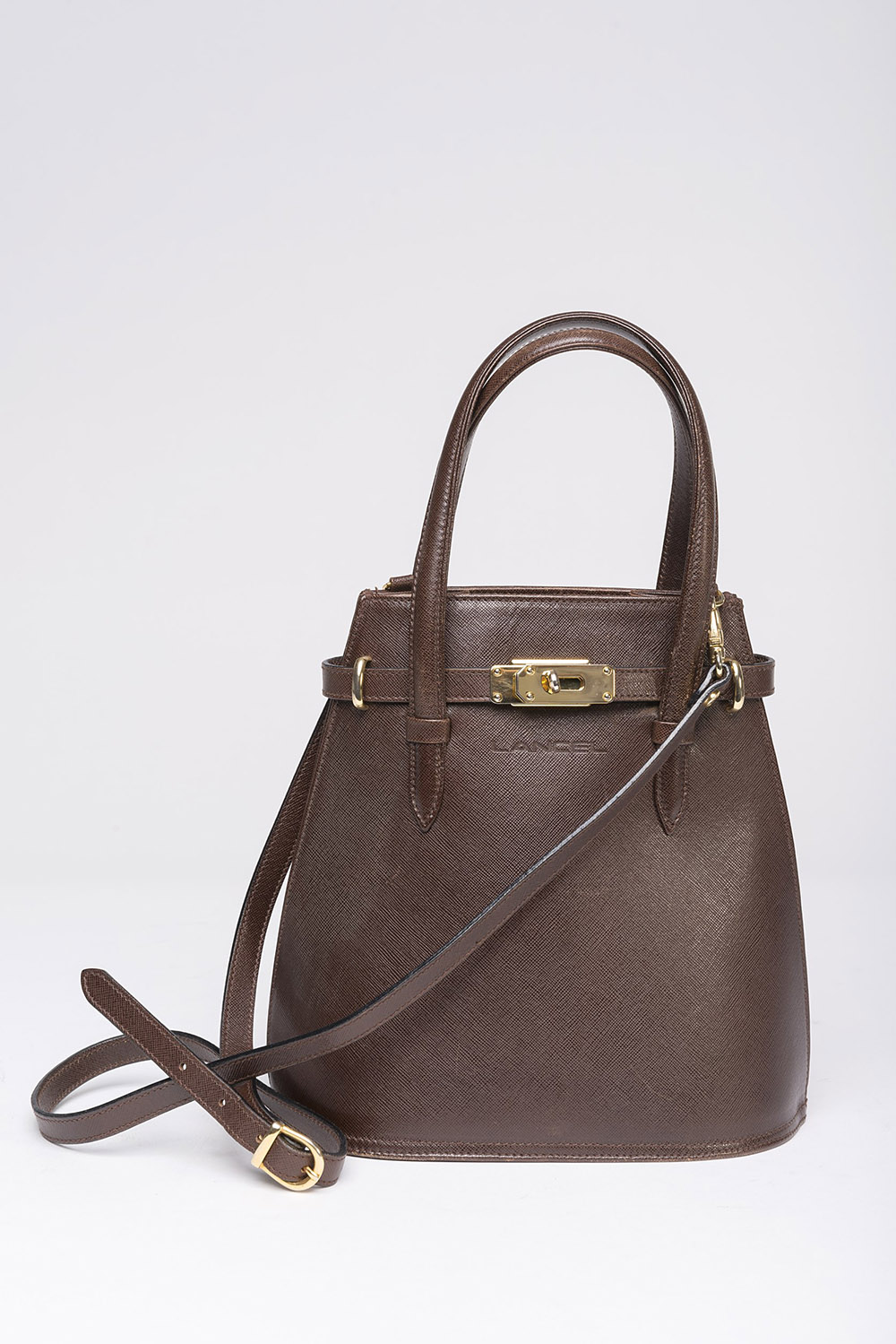 LANCEL, PARIS Borsa in cuoio zigrinato con doppio manico e tracolla, dettagli in metallo dorato, cm 24 (lievi segni d'uso)