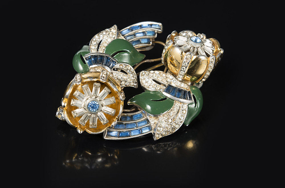 CORO Spilla duette tremblant in metallo dorato con smalti verdi, strass blu ed incolori a formare due fiori contrariÈ. Separabile in due clips.