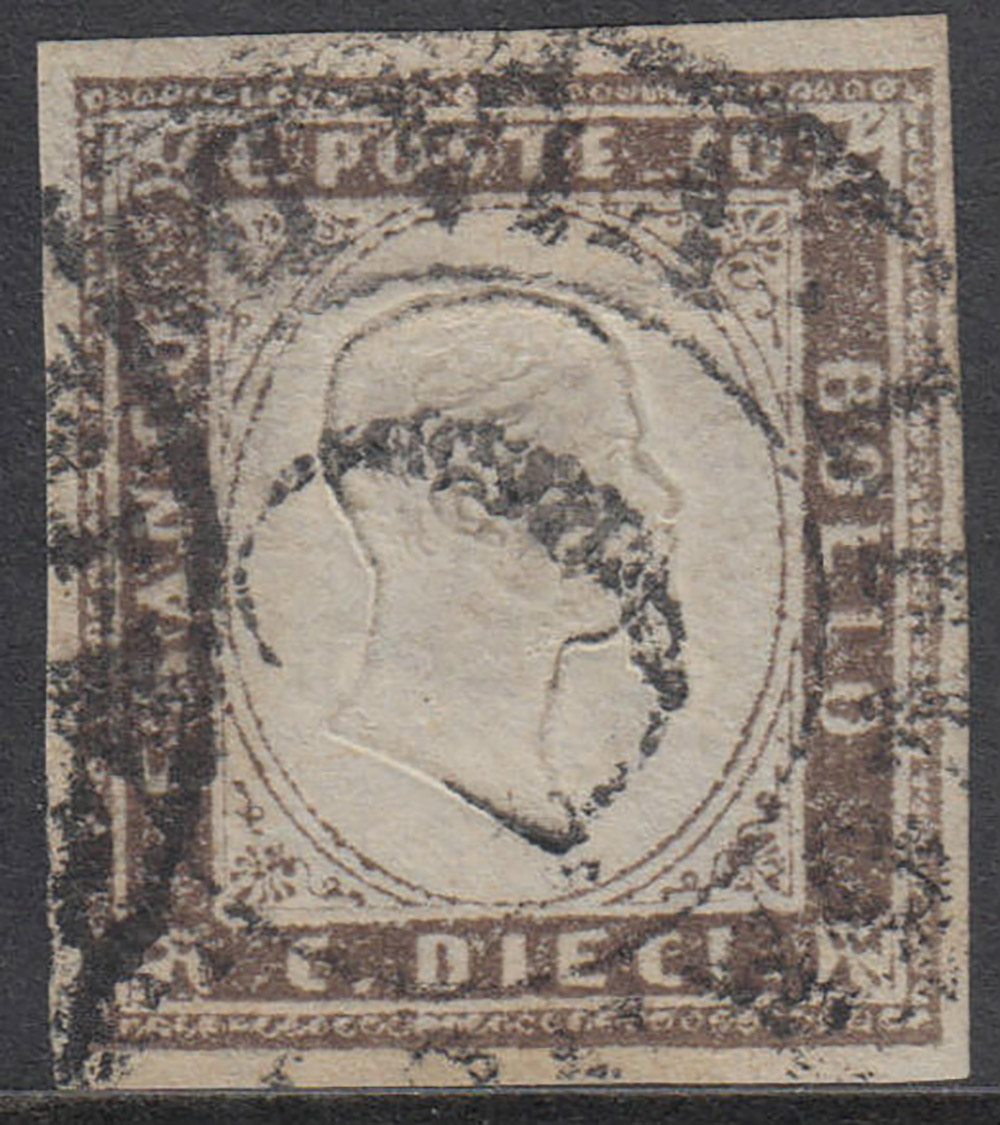 [SARDEGNA] 1859 10c. bruno violaceo, annullato con bollo toscano a due cerchi...