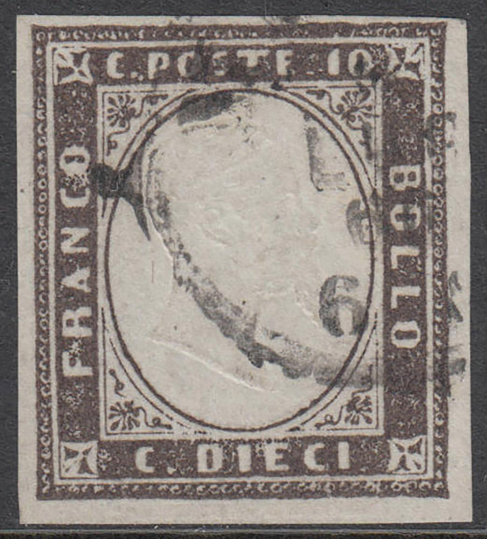 [SARDEGNA] 1858 10c. bruno cioccolato scuro. Cert. G. Bottacchi . Used..........(Sass.14Af)