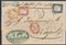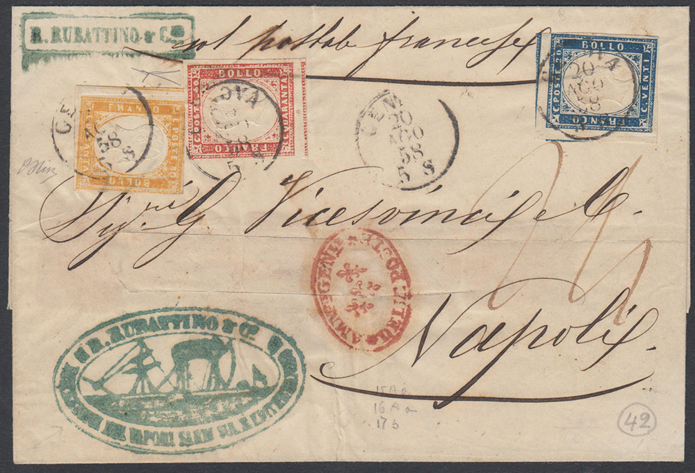 [SARDEGNA] 1858 (20 ago.) Lettera con affrancatura tricolore da 1,30 lire da Genova per Napoli, tassata per 24 grani per il porto interno napoletano e trasportata dalla compagnia marittima Rubattino di Genova che appose i propri timbri commerciali sul frontespizio. G. Oliva, Cert. G. Bottacchi. Cover..........(Sass.15Aa,16Ab,17b)