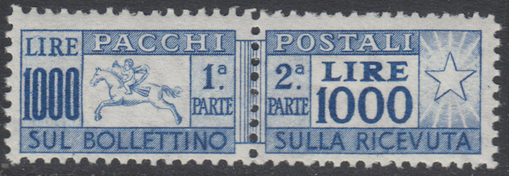 [REPUBBLICA] 1954 Pacchi postali, 1000 lire filigrana ruota, "Cavallino". D....