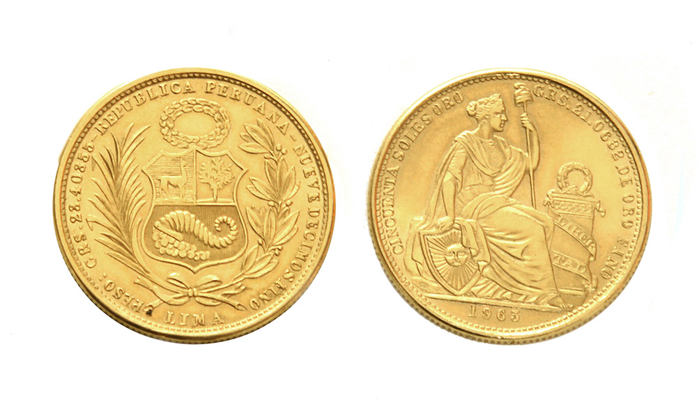 [PERU'] 1965 50 Soles "Libertad" in oro 916/1000.