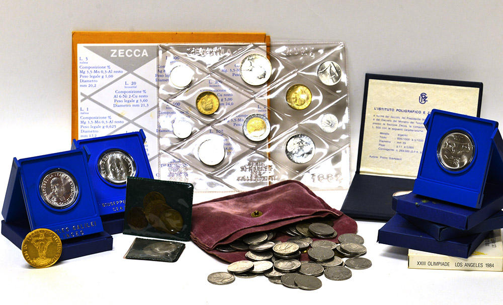 [AREA ITALIANA] Scatola contenente monete commemorative italiane e un sacchetto di monete circolate del Regno d'Italia, notata una moneta commemorativa in oro di Giovanni XXIII "Pacem in terris pro-mundi vita" del 1963.