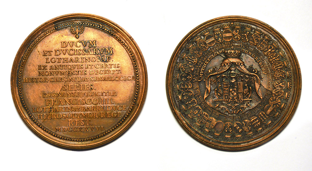 [MODENA LORENA] Francesco III Duca di Lorena, 1736, grande stemma su un lato e al verso iscrizione in latino: "DUCUM / ET DUCISSARUM / LOTHARINGIAE. / EX ANTIQUIS ET CERTIS / MONUMENTIS DECERPT. / HISTOR. CHRONOL. ET GENEALOGICA / SERIES REGNANTE FELICITER / FRANCISCO. III. / LOTHARIN ET BARRI DUCE / HIEROSOLYMOR. REGE / REST. / MDCCCXXXVI." Splendida e rara.