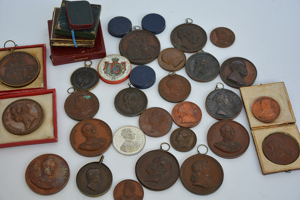 [PERSONAGGI ILLUSTRI] Insieme di 26 medaglie (alcune ripetute) dedicate a varie personalit‡ dell' '800 e dei primi del '900. Incluse alcune scatolette vuote.