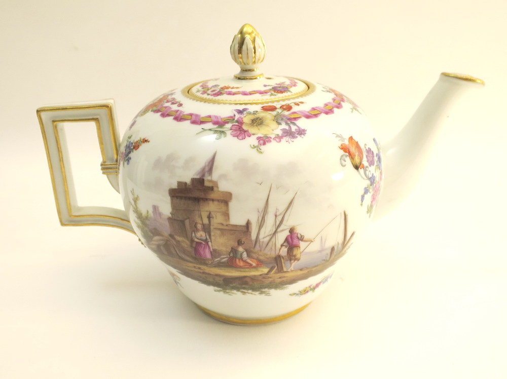 Teiera in porcellana di forma globulare e decoro policromo con scene di porto, Meissen 1780 ca. cm. 18,5x12