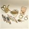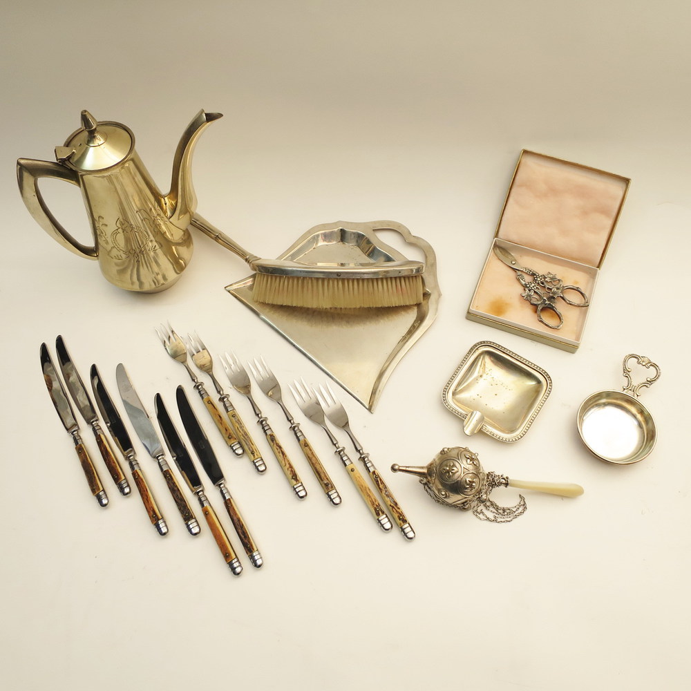 Lotto composto da una forbice per uva, due posaceneri in argento, una paletta con vassoio raccogli bricciole in argento, un sonaglio in argento, 12 posate con impugnatura in osso e una caffettiera in metallo argentao