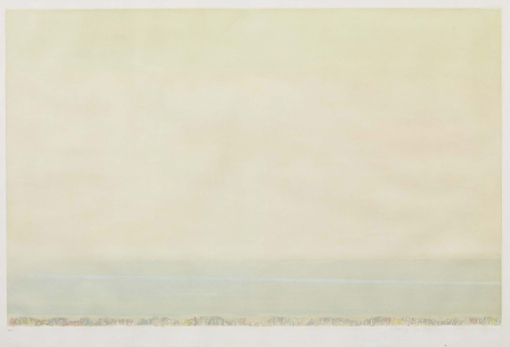 Piero Guccione, Scicli (Rg) 1935, Marina, Acquaforte e acquatinta a colori, es. 99/99, cm. 98x153,5 (lastra), cm. 115x172 (carta), Firma a matita sul margine in basso a destra: Guccione, tiratura in basso a sinistra: 99/99: in basso: timbro a secco Il Cigno Stamperia d'Arte: timbro a secco Il Cigno Galileo Galilei, Edizioni di Arte e Scienza: timbro a secco Ministero dei Beni Culturali 1492-1992, Comitato Celebrazioni Colomnbiane Arte Contemporanea$500$Colombo 92. Al verso, su un cartone di supporto: etichetta e timbro Galleria d'Arte Roggia Grande, Trento.,