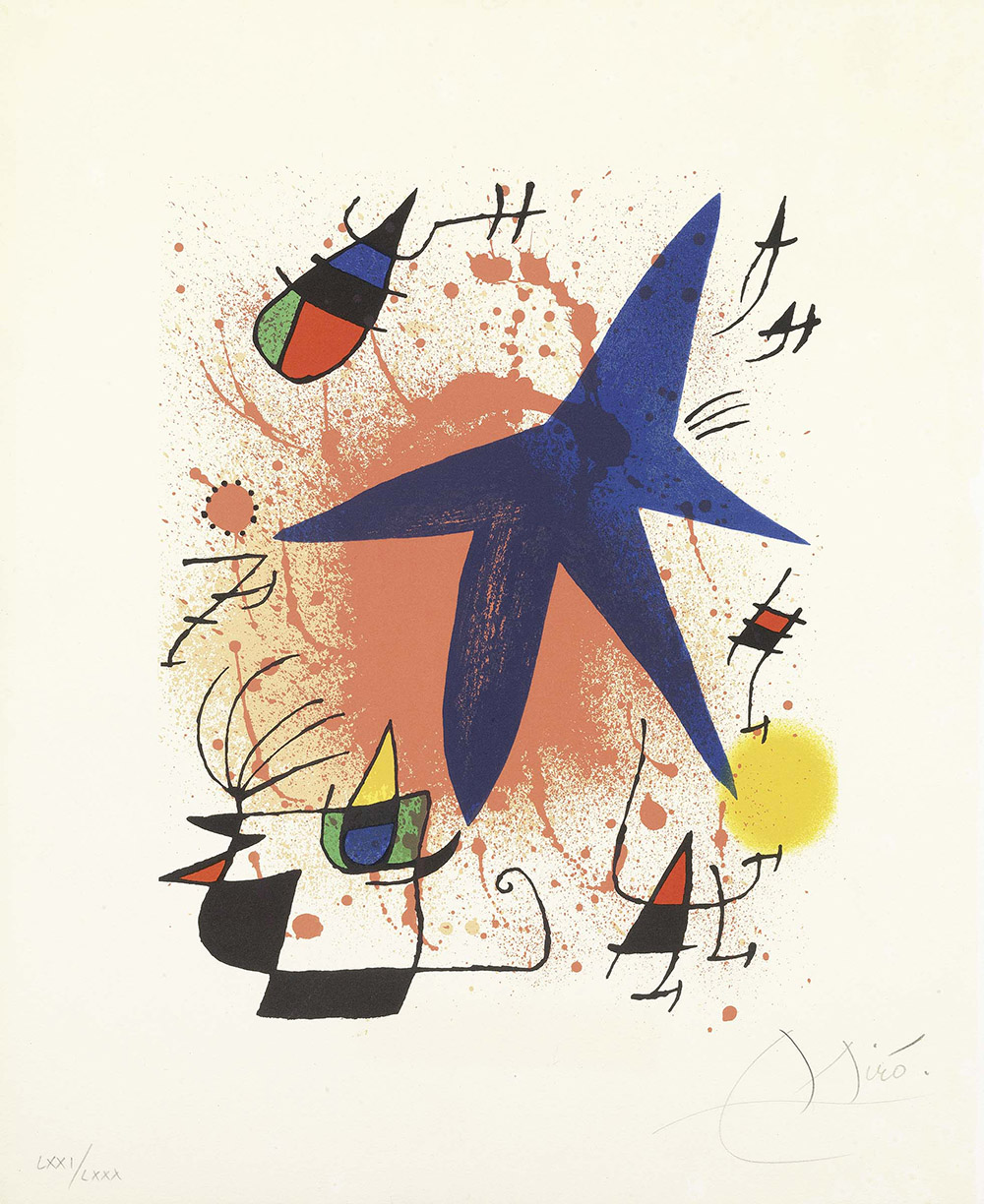 Joan Miró, Barcellona 1893 - Palma di Maiorca 1983, Miró litógrafo I, 1972, Litografia, es. LXXI/LXXX, cm. 45x36,5, Firma a matita in basso a destra: Mirò, tiratura in basso a sinistra: LXXI/LXXX., Tiratura di 80 esemplari in numeri romani, editore A.C. Mazo, Maeght, Parigi, Poligrafa, Barcellona, stampatore Mourlot, Parigi., Bibliografia: Joan Miró Litografo, IV, 1969-1972, La Poligrafa S.A., Barcelona, 1982, p. 197, n. 857.,