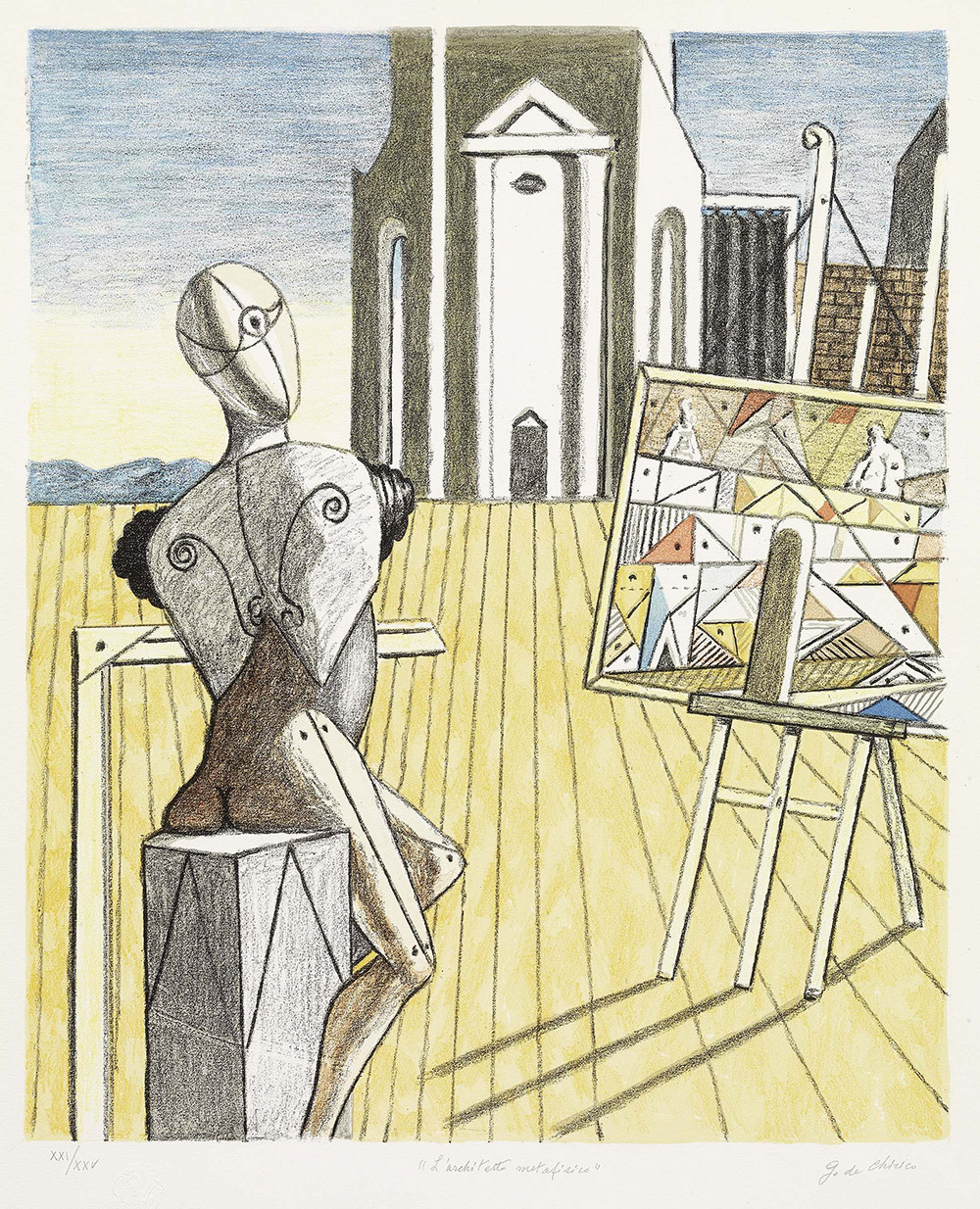 Giorgio de Chirico, Volos 1888 - Roma 1978, L'architetto metafisico, 1970, Litografia a 9 colori, es. XXI/XXV, cm. 55,5x46 (lastra), cm. 70x53,5 (carta), Firma a matita sul margine in basso a destra: G. de Chirico, tiratura in basso a sinistra: XXI/XXV, titolo in basso al centro: "L'architetto metafisico", timbri a secco GdeC e Alberto Caprini Stampatore in Roma., Tiratura di 99 esemplari in numeri arabi, 25 in numeri romani, 21 contrassegnati dalle lettere da A a Z e 12 prove d'artista., Bibliografia: Edoardo Brandani, Giorgio de Chirico. Catalogo dell'opera grafica 1969-1977, Edizioni Bora, Bologna, 1990, p. 106, n. 87.,