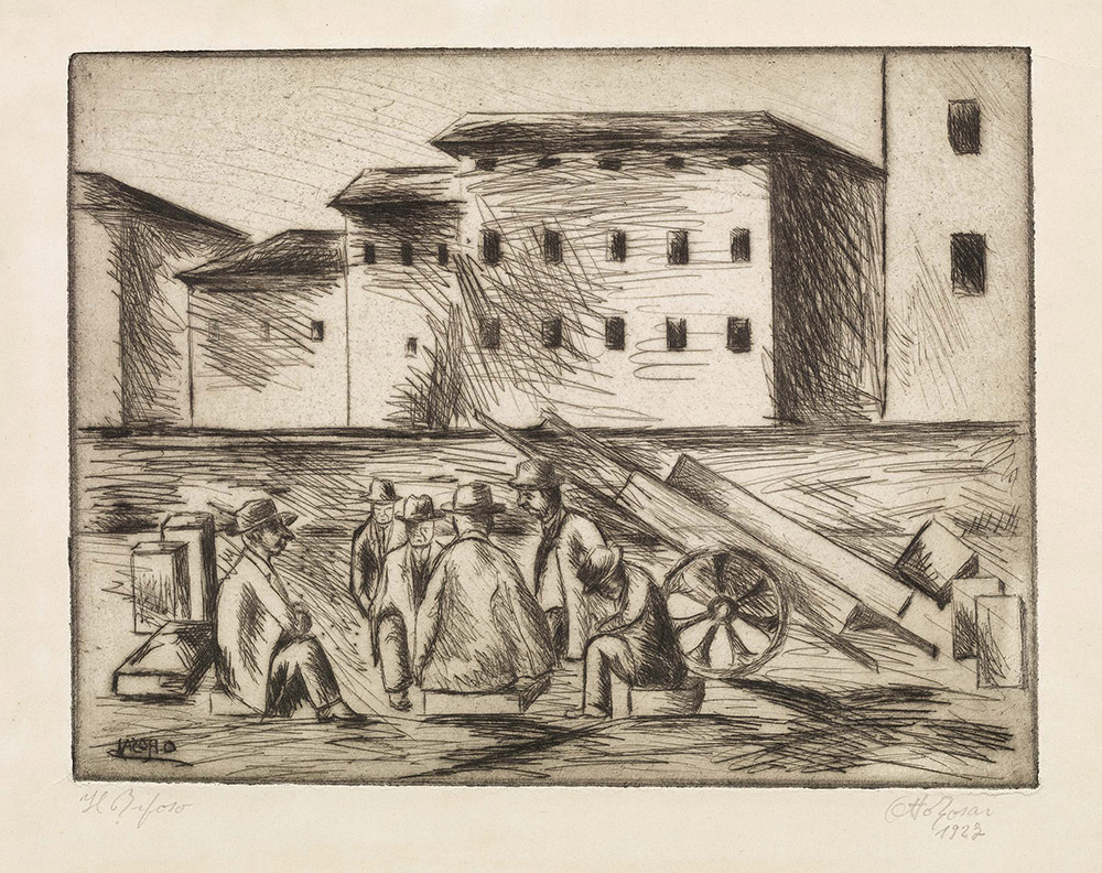 Ottone Rosai, Firenze 1895 - Ivrea (To) 1957, Il Riposo, 1927, Acquaforte, cm. 25,5x32 (carta), cm. 18,7x24,5 (lastra), Firma e data a matita sul margine in basso a destra: Otto Rosai$1927, titolo in basso a sinistra: Il Riposo, firma in lastra in basso a sinistra: O. Rosai (speculare), timbro a secco in basso a destra: Libreria$Prandi$Reggio$E.,