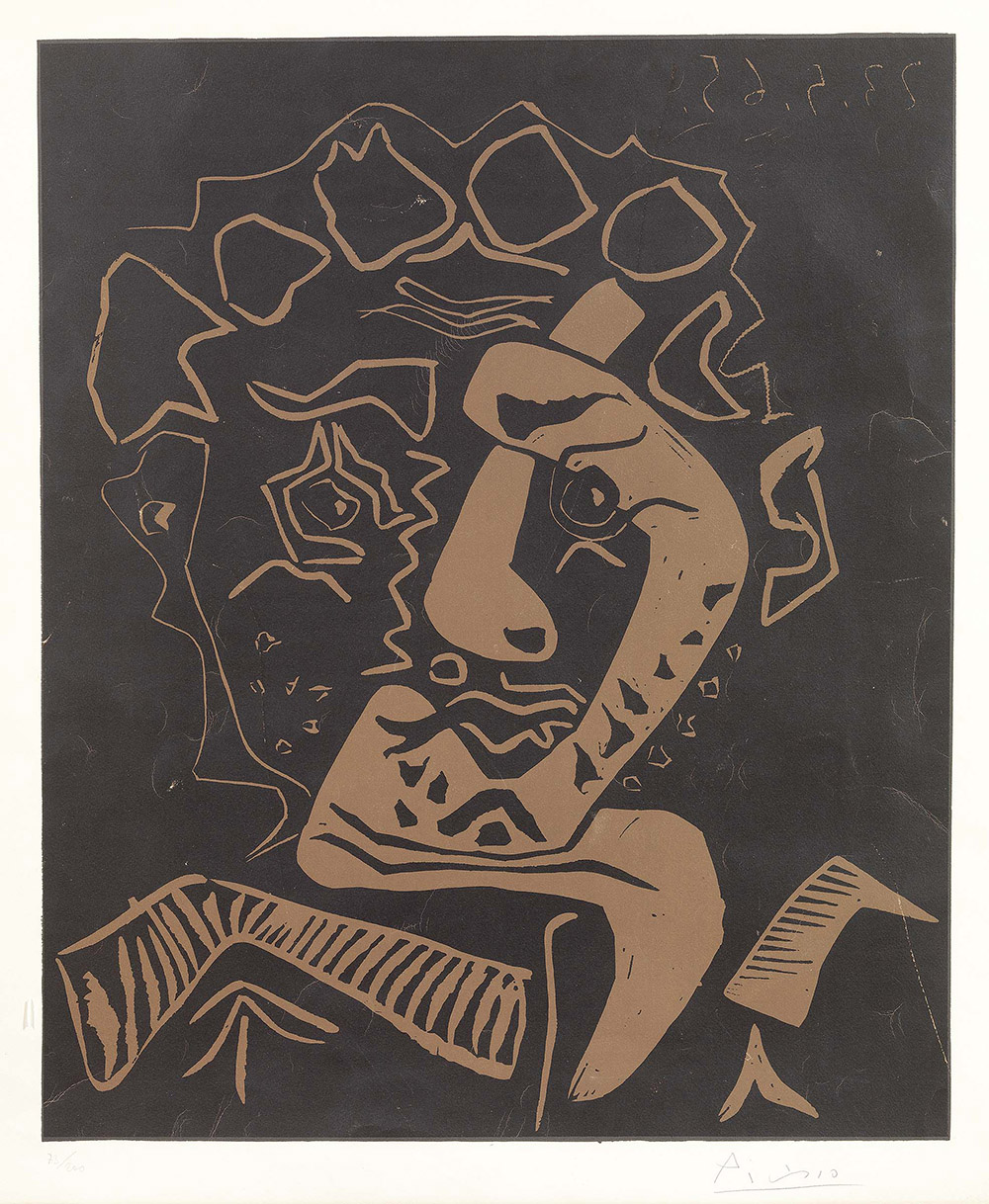 Pablo Picasso, Malaga 1881 - Mougins 1973, Le Danseur, 1965, Incisione su linoleum, es. 73/200, cm. 63,6x52,3 (lastra), cm. 73,8x60,2 (carta), Data in lastra in alto a destra: 23.5.65 (speculare); firma a matita sul margine in basso a destra: Picasso, tiratura in basso a sinistra: 73/200., Tiratura di 200 esemplari. Realizzata per l'esposizione Picasso et le Théatre, Tolosa, Musée des Augustins, giugno - settembre 1965., Bibliografia: Georges Bloch, Pablo Picasso. Tome II Catalogue de l'oeuvre gravé et lithographié 1966-1969, Kornfeld et Klipstein, Berne, 1971, p. 342, n. 1849 (con misure errate).,