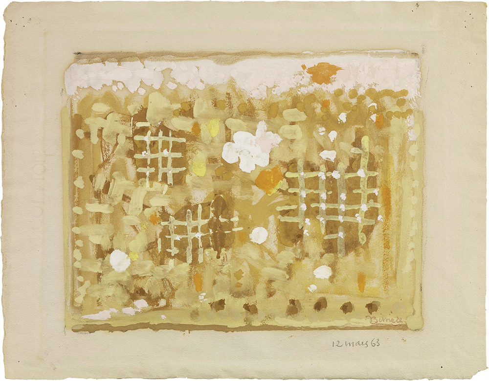 Roger Bissière, Villeréal 1888 - Boissierette 1964, Composizione, 1963, Olio e tecnica mista su carta, cm. 36x45,8, Firma e data in basso a destra: Bissiere$12 mars 63. Al verso, su un cartone di supporto: etichetta [Galer]ie Jeanne Bucher, Paris.,