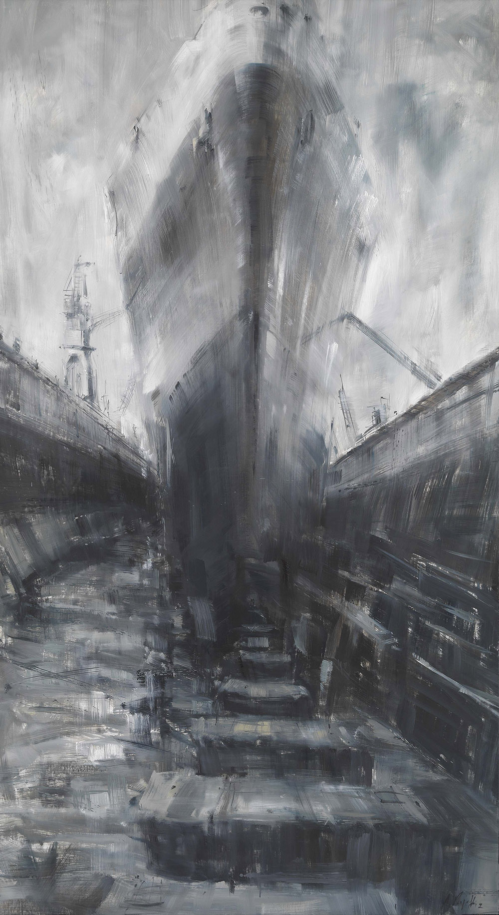 Alessandro Papetti, Milano 1958, Bacino di carenaggio, 2002, Olio su tela, cm. 205x112, Firma in basso a destra: A. Papetti; titolo, data e firma al verso sulla tela: "Bacino di carenaggio"$2002$A. Papetti.,