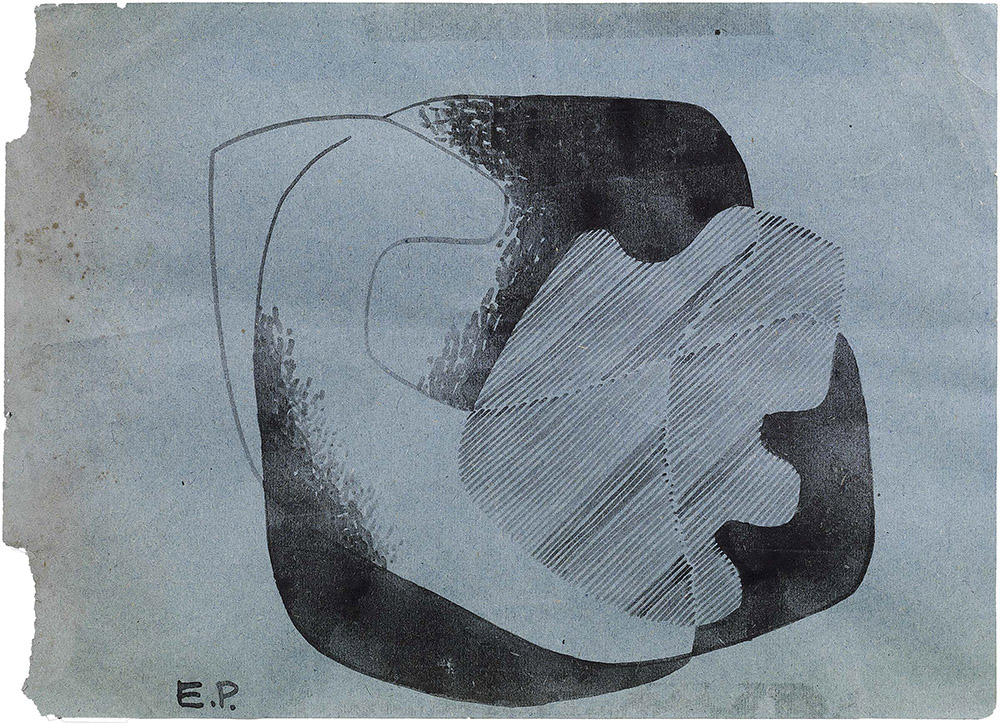 Enrico Prampolini, Modena 1894 - Roma 1956, Astrazione plastica, (1938), Inchiostro su carta, cm. 14,7x20,4, Sigla in basso a sinistra: E.P. Al verso della cornice: timbro ed etichetta con n. 8909 Arte Centro, Milano (opera datata 1938)., Esposizioni: Enrico Prampolini, Milano, Arte Centro, novembre 2002 - gennaio 2003, cat. n. 8, illustrato a colori.,