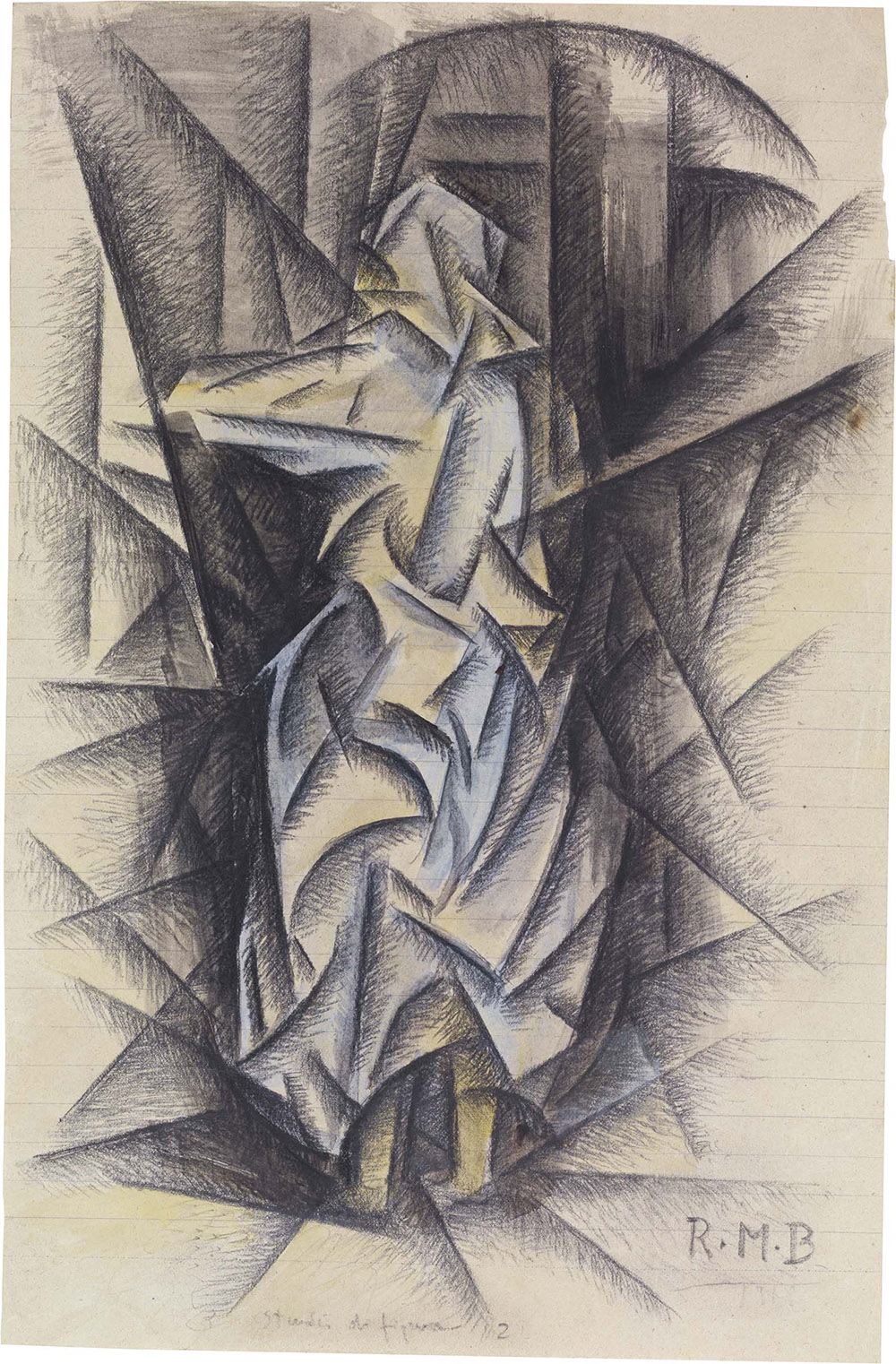 Roberto Marcello (Iras) Baldessari, Innsbruck 1894 - Roma 1965, Studio di figura 2, 1916 ca., Carboncino, acquerello e matita su carta, cm. 30,1x19,5, , Sigla in basso a destra: R.M.B., titolo in basso al centro: Studio di figura 2. Al verso abbozzo di altra composizione a carboncino con Studio Dinamico, probabilmente della fine del 1915., , Esposizioni, Baldessari, Opere 1915 - 1934, a cura di M. Scudiero, Cortina d'Ampezzo, Galleria d'Arte Frediano Farsetti, 27 dicembre 2008 - 7 gennaio 2009; poi Milano, Farsettiarte, 15 gennaio - 14 febbraio 2009, cat. n. 24, illustrato a colori., ,