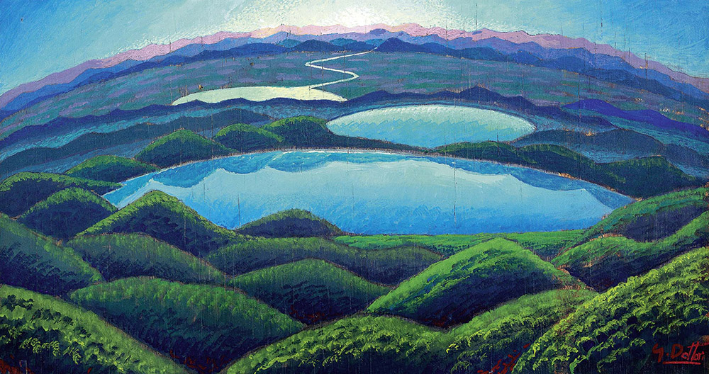 Gerardo Dottori, Perugia 1888 - 1977, Bozzetto per Aurora umbra, 1942, Tempera su compensato, cm. 31,2x58,7, , Firma in basso a destra: G. Dottori; firma, titolo e data al verso: G. Dottori / Bozzetto per / "Aurora umbra" / (tempera 1942)., , Certificato su foto Archivi Gerardo Dottori, con n. 2123., ,