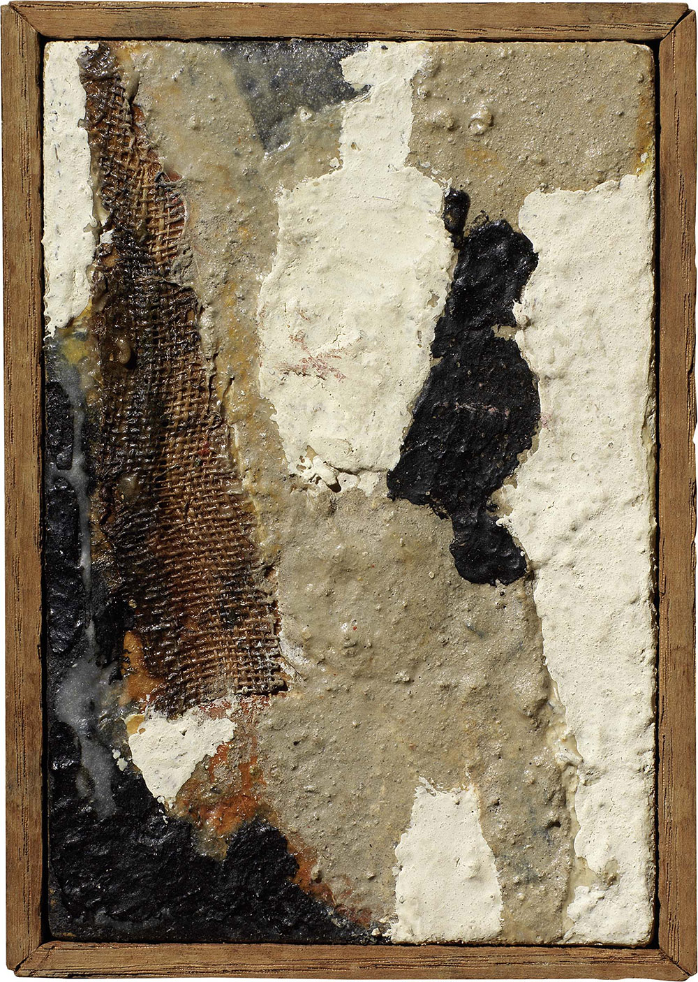 Alberto Burri, Città di Castello (Pg) 1915 - Nizza 1995, Senza titolo, (1952), Sacco, acrilico, pietra pomice, bianco di zinco, vinavil, combustione su faesite, cm. 13,5x9,5, , Firma al verso: Burri., , Certificato con foto Fondazione Palazzo Albizzini, Collezione Burri, Città di Castello, 17 luglio 2009, Prot. 311-2009 MC/nc, con n. 52.97., , Esposizioni, Alberto Burri. Tra Materia e Forma. Opere scelte 1948 - 1993, Torino, Mazzoleni Galleria d'Arte, 17 ottobre - 31 dicembre 2003, cat. pp. 24, 25, n. 7, illustrato a colori., , Bibliografia, Alberto Burri. Catalogo generale, tomo I, Pittura 1945-1957, a cura di Bruno Corà, Fondazione Palazzo Albizzini Collezione Burri, Città di Castello 2015, p. 82, n. 143., ,