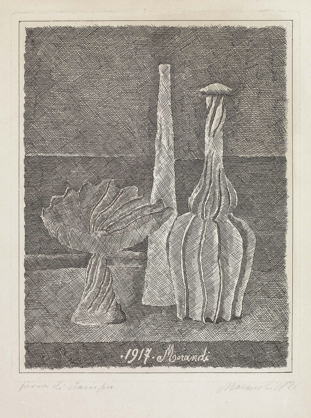 Giorgio Morandi, Bologna 1890 - 1964, Natura morta con compostiera, bottiglia lunga e bottiglia scannellata, 1928, Acquaforte su zinco, es. prova di stampa, cm. 23,5x18,2 (lastra), cm. 32x24,5 (carta), , Data e firma in lastra in basso al centro: 1917 Morandi, a matita sul margine in basso a destra firma e data: Morandi 1928, tiratura in basso a sinistra: prova di stampa. Al verso su un cartone di supporto: etichetta e timbro Galleria d'Arte Maggiore, Bologna., , Primo stato su due, tiratura di 50 esemplari numerati, in parte su carta India incollata. Alcuni esemplari precedenti alla tiratura realizzati per gli amici. Dal quadro del 1916 (e non del 1917, come indicato per errore nella lastra)., , Bibliografia, Lamberto Vitali, L'opera grafica di Giorgio Morandi, Giulio Einaudi Editore, Torino, 1964, n. 50;, Michele Cordaro, Morandi incisioni. Catalogo Generale, Edizioni Electa, Milano, 1991, p. 57, n. 1928 10., ,