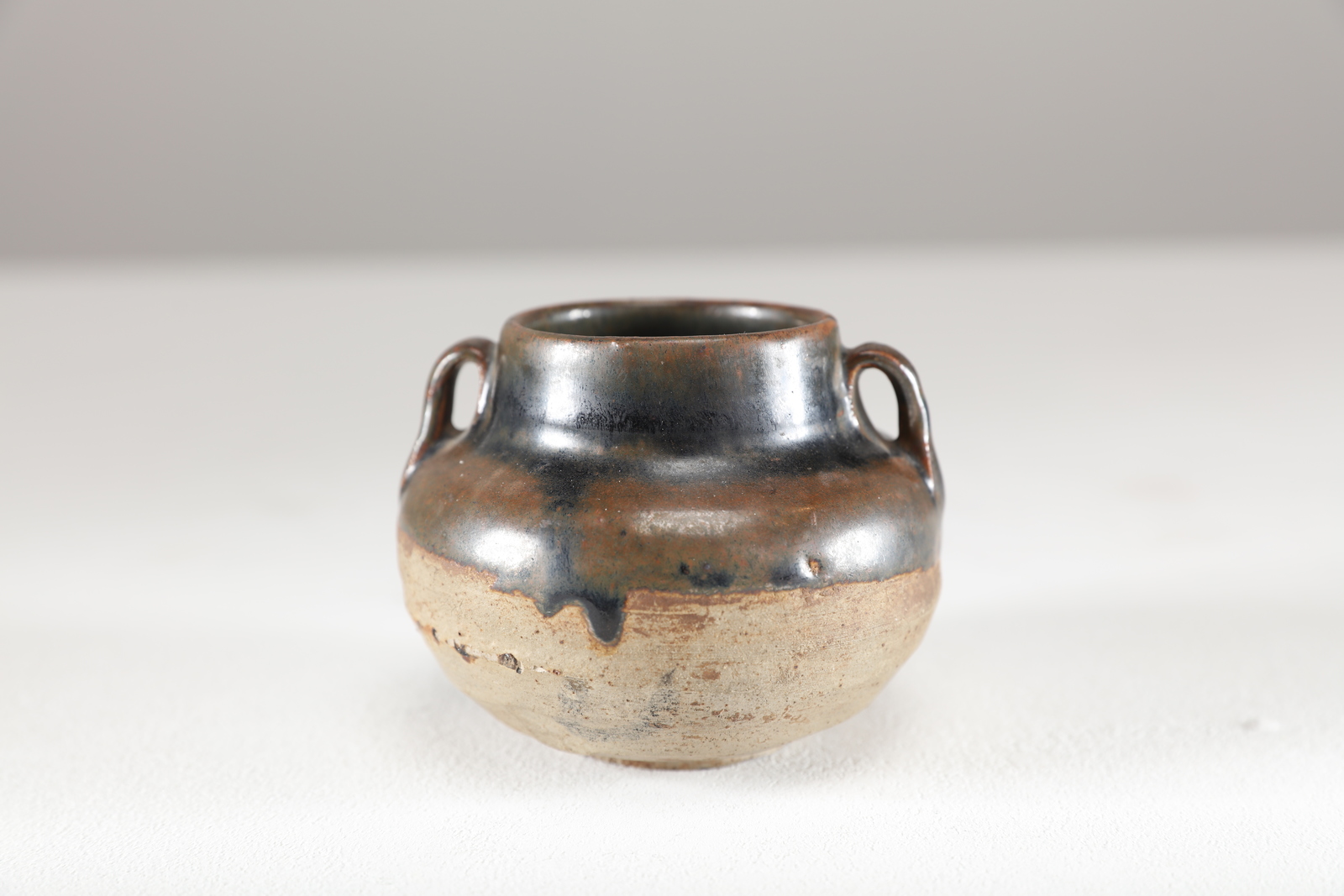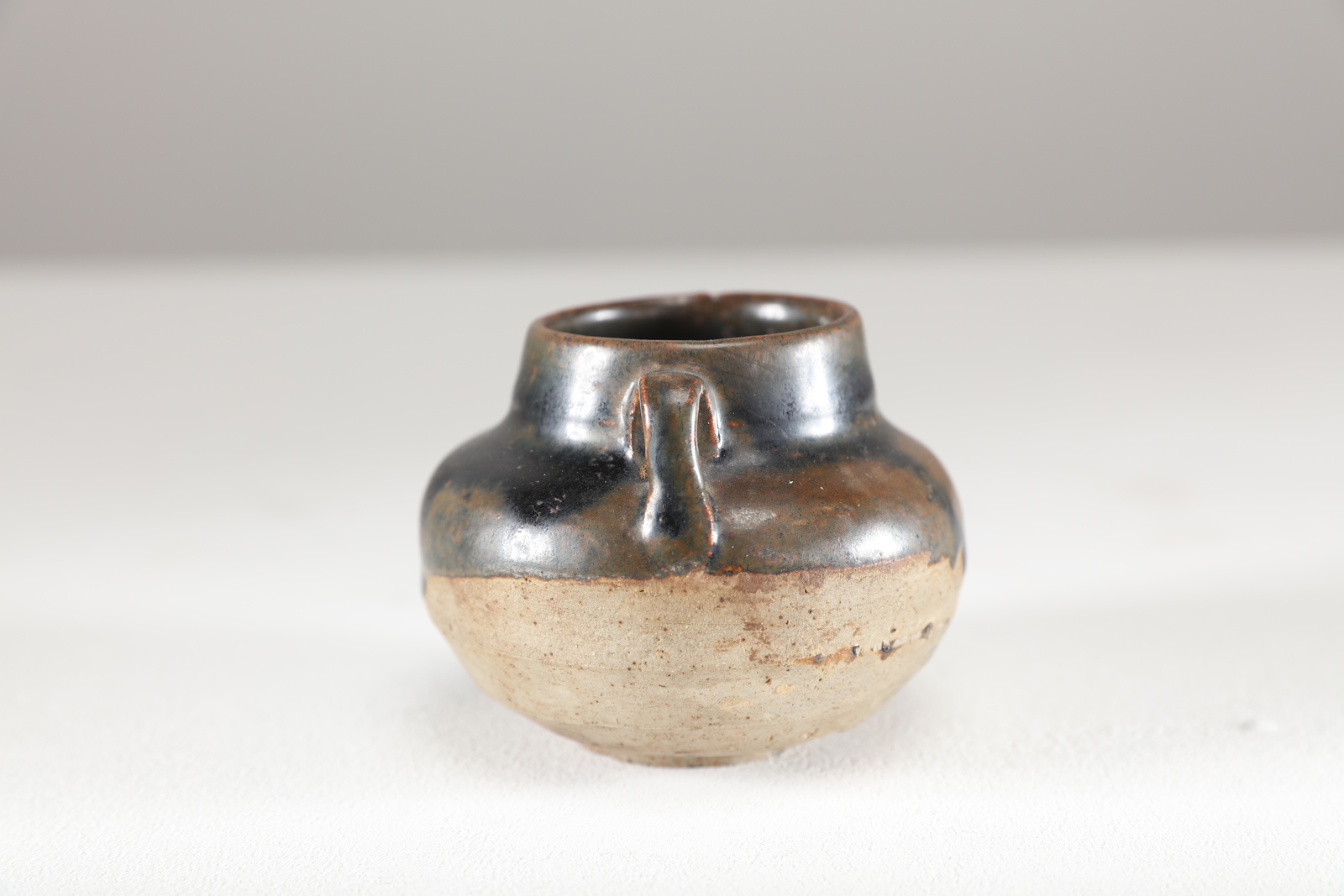 Cina, dinastia Ming . -. Cm 6,80. Piccolo vaso biansato con corpo globulare poggiante su disco. La spessa vetrina scura a "pelo di lepre" riveste l'interno e la parte superiore dell'esterno, terminando in colature decorative.