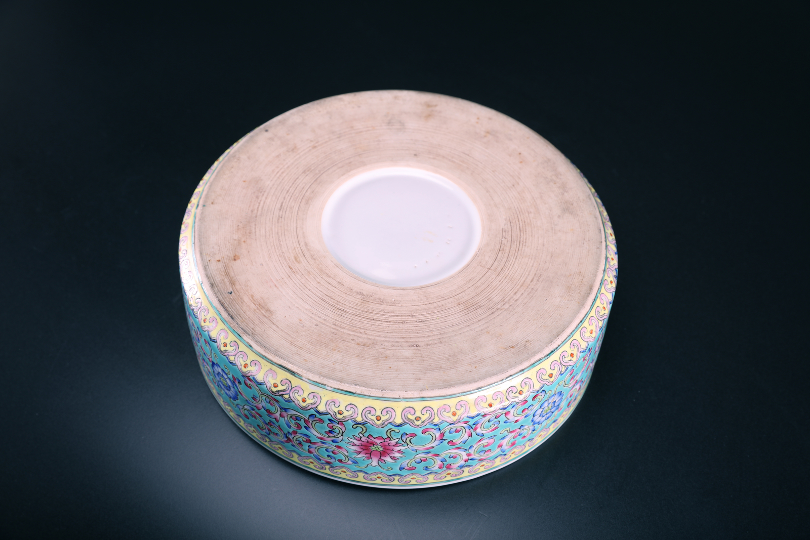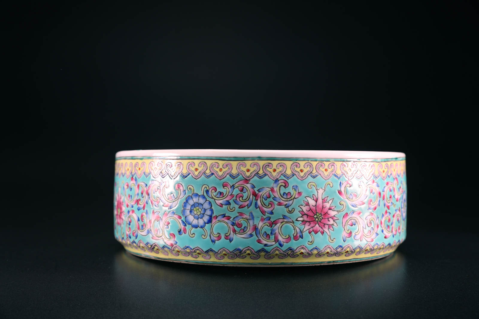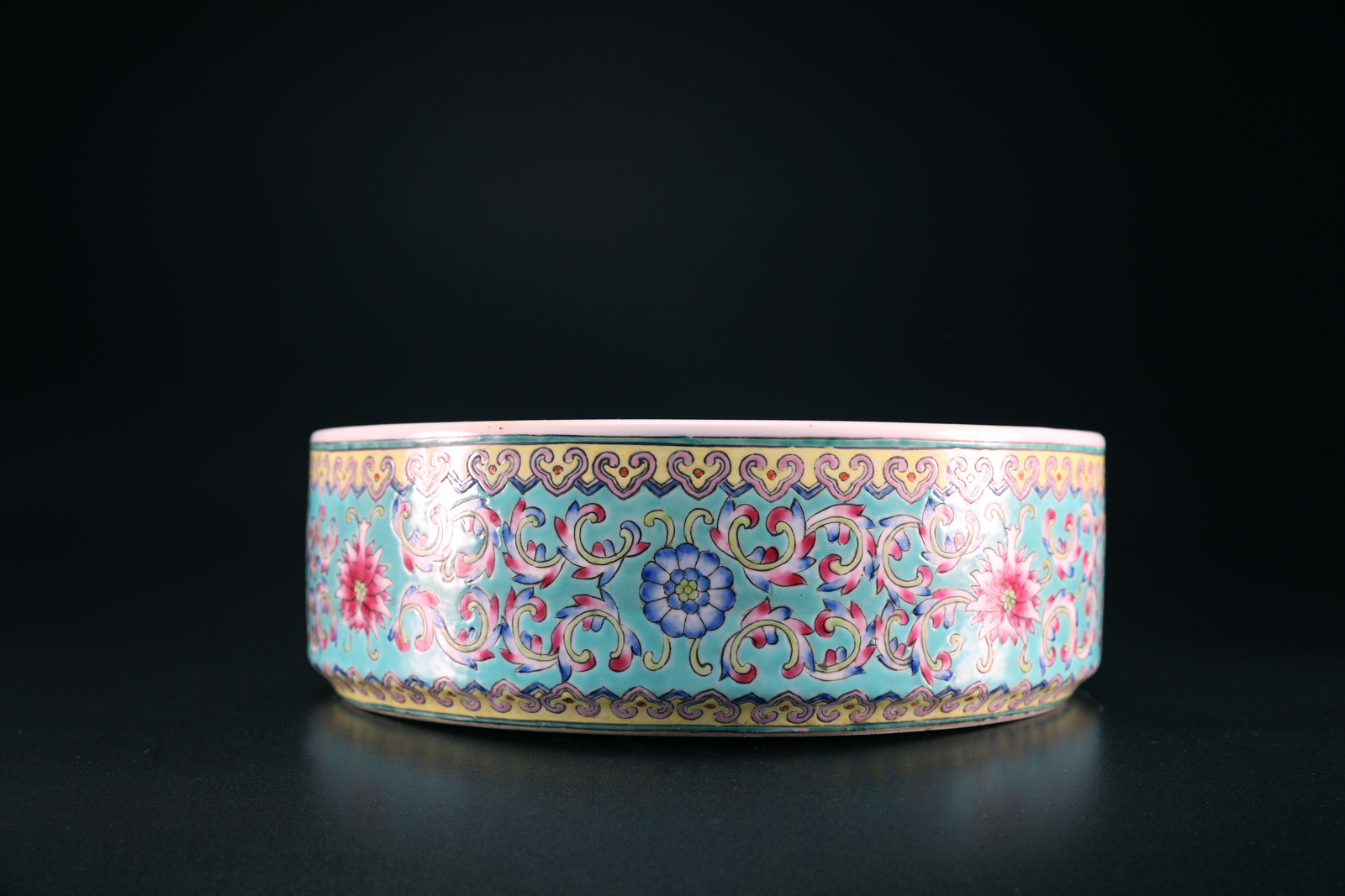 Arte Cinese Grande lavapennelli circolare in porcellana smaltata e decorata con fiori e tralci su fondo verde acqua