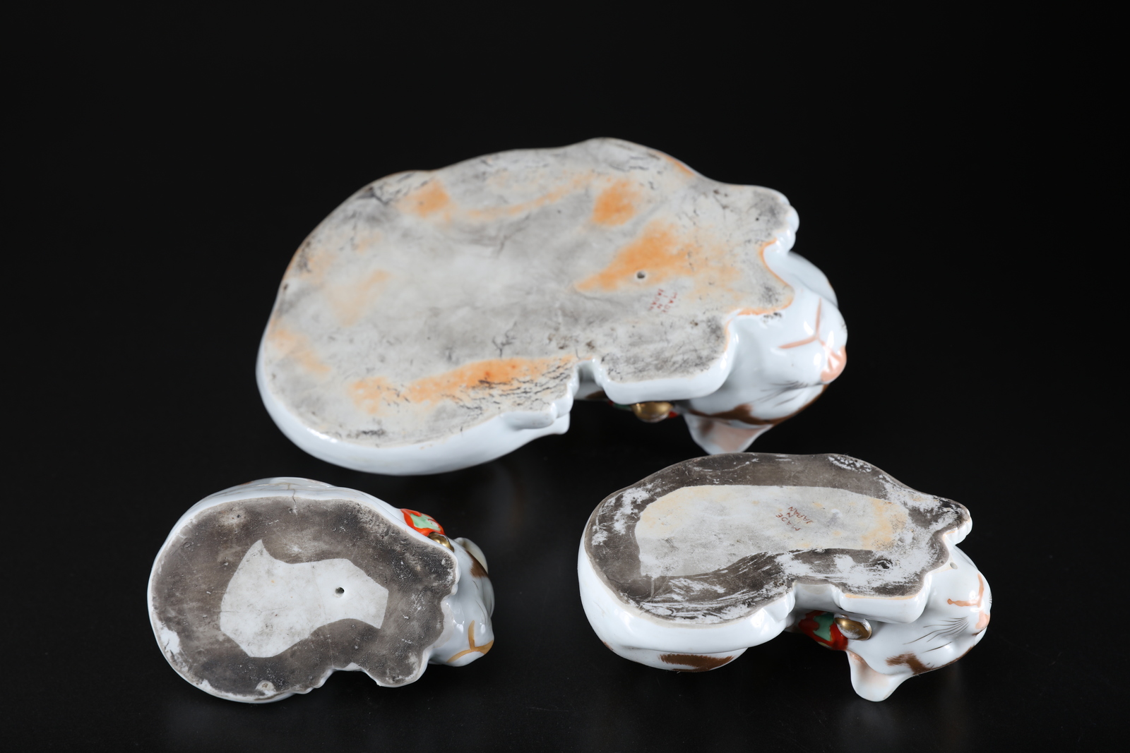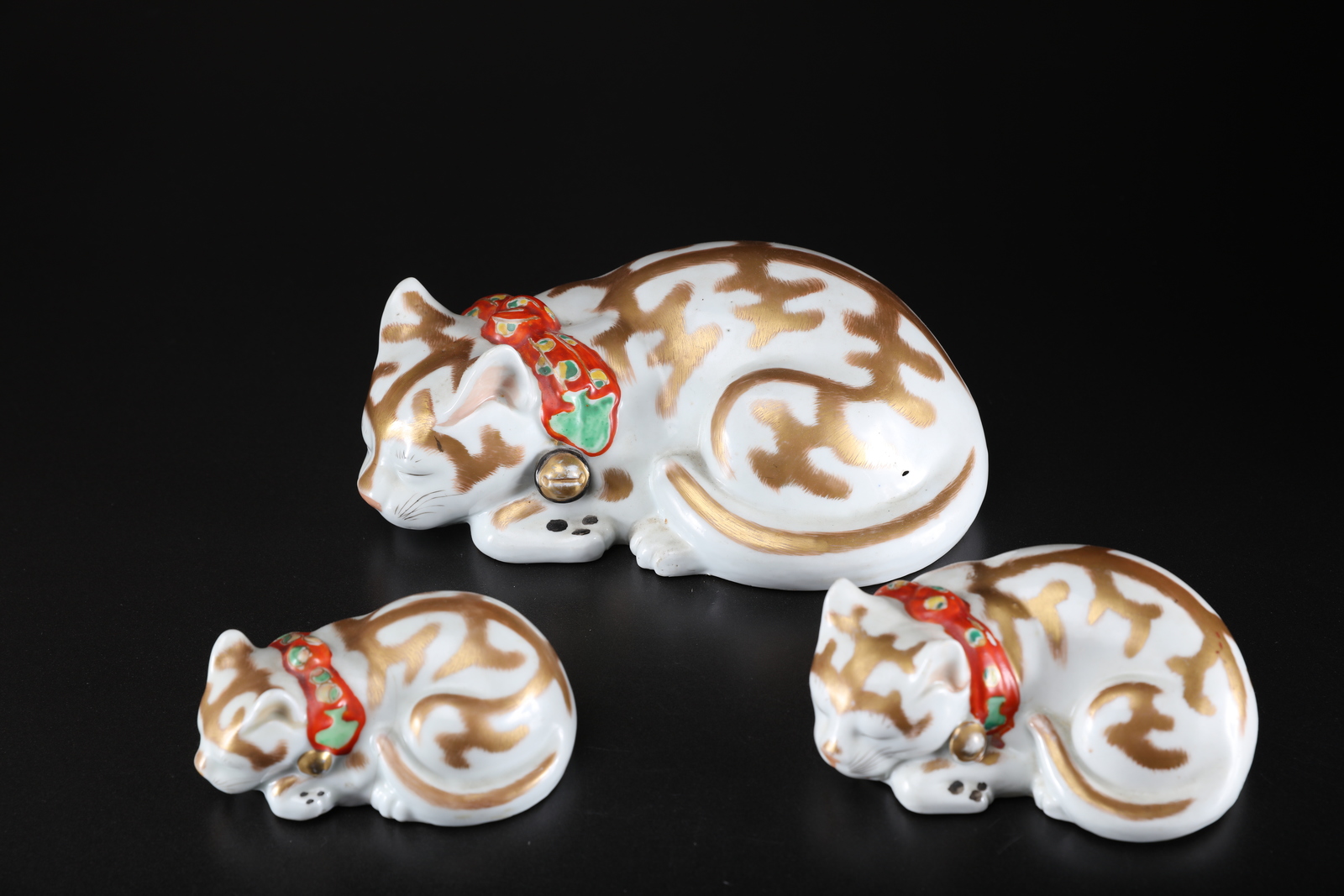 Arte Giapponese A group of three kutani sleeping cats each with gilded markings and wearing iron-red, green and yellow collars