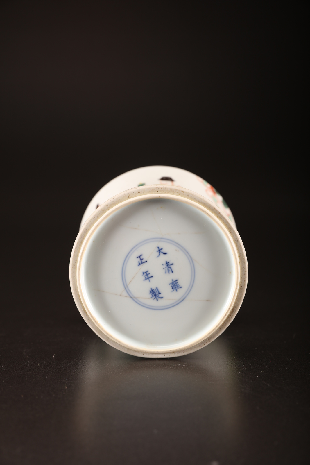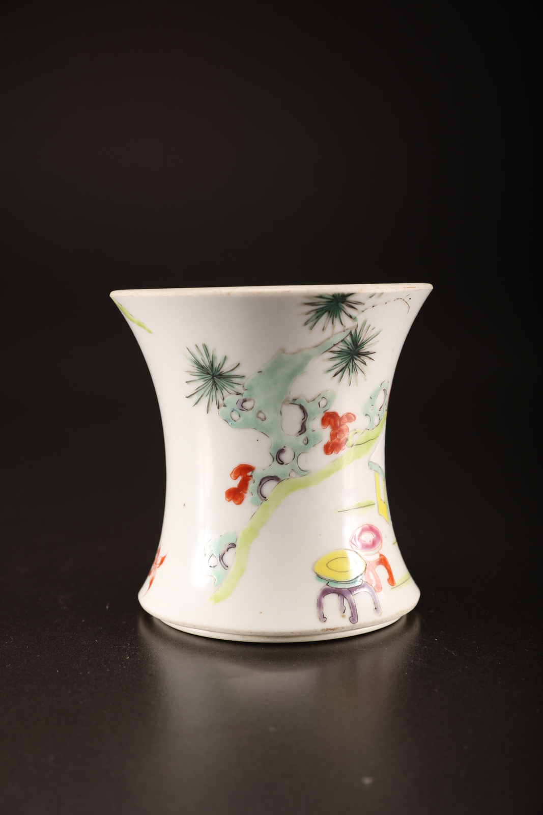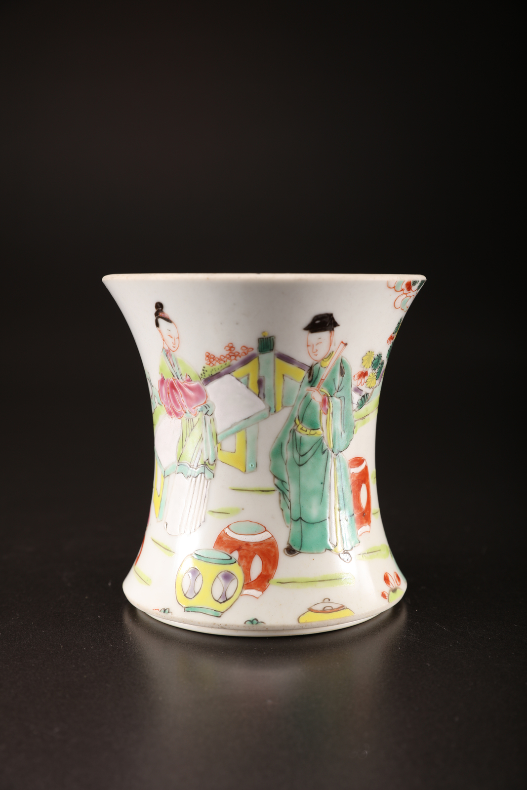 Arte Cinese A polychrome porcelain brushpot depicting a scholar and a lady in a garden. Yongzheng six characters mark within double circle at the base