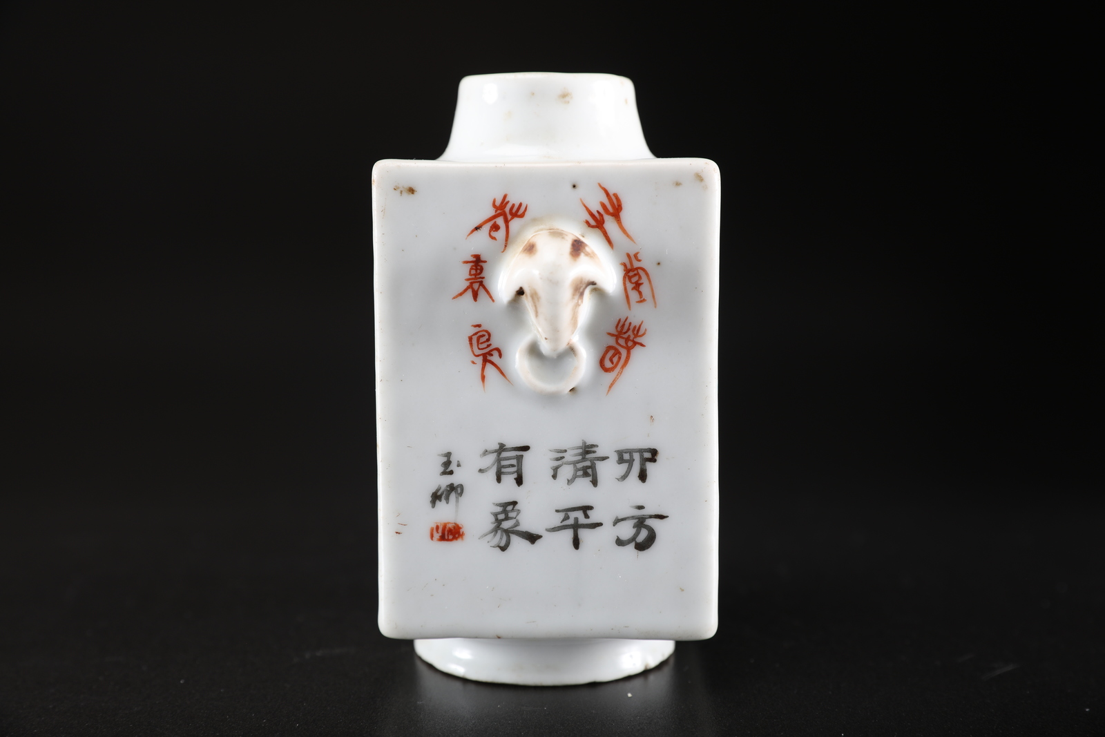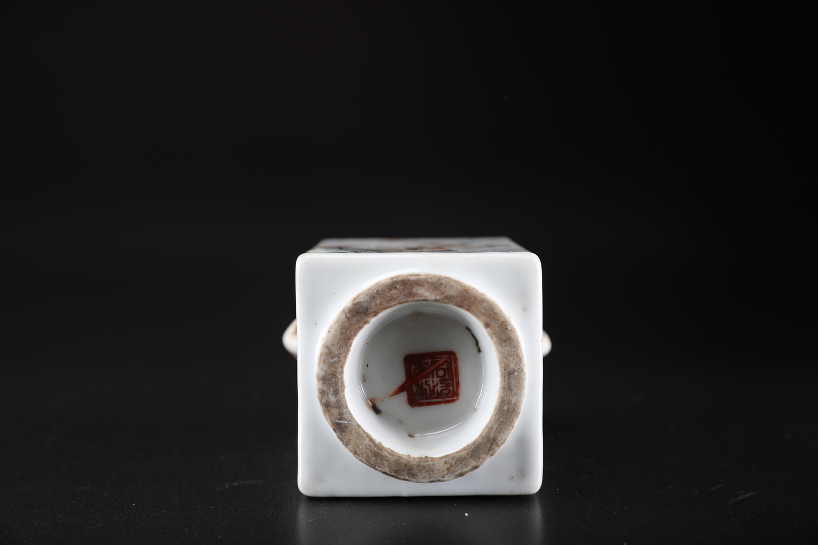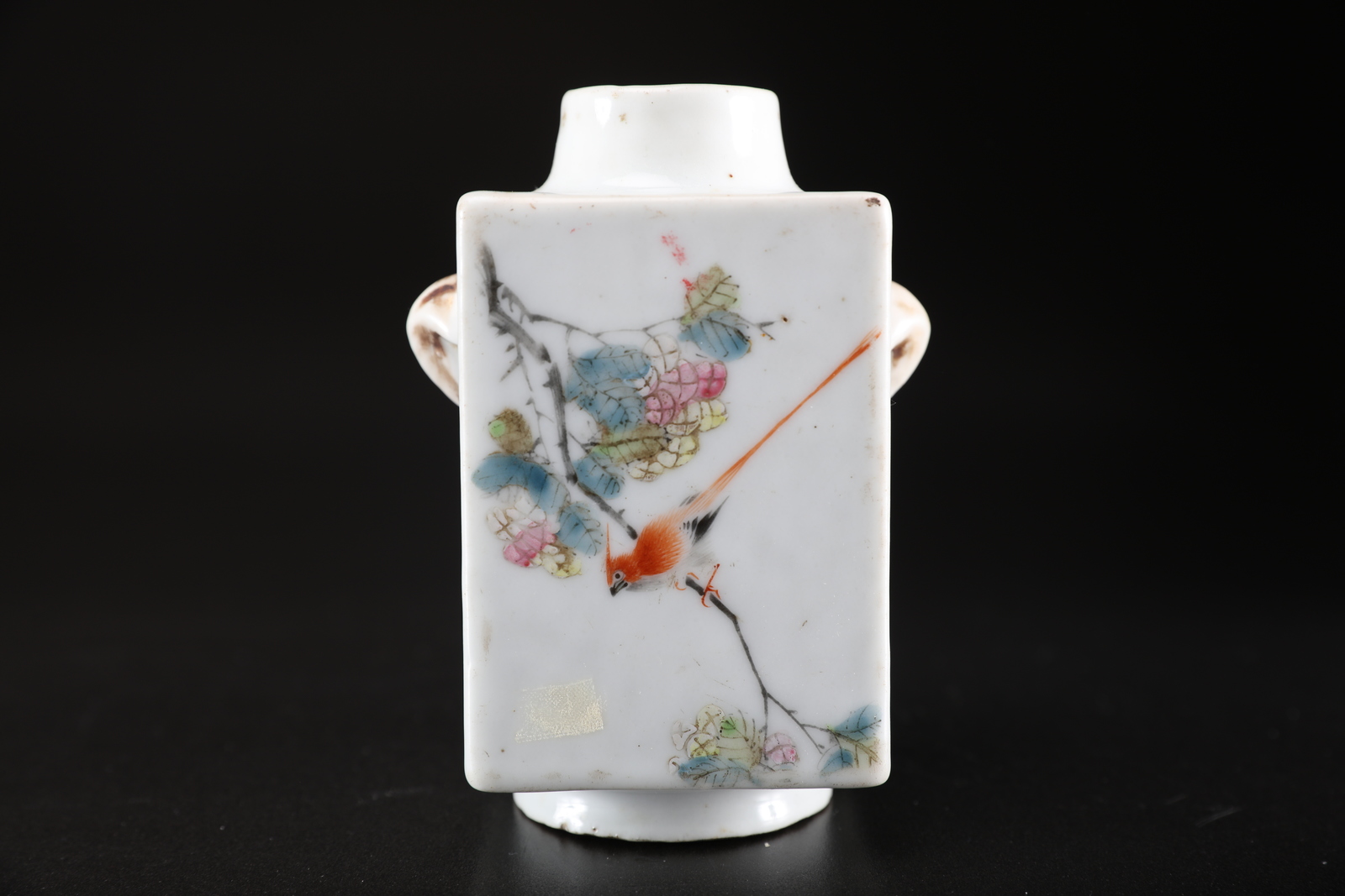 Arte Cinese Vasetto rettangolare in porcellana policroma dipinto con uccelli su rami fioriti ed iscrizioni con marchio e sigillo dell'artista