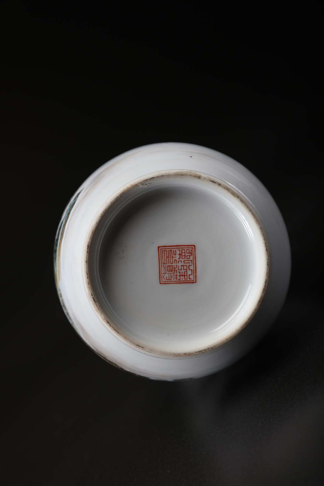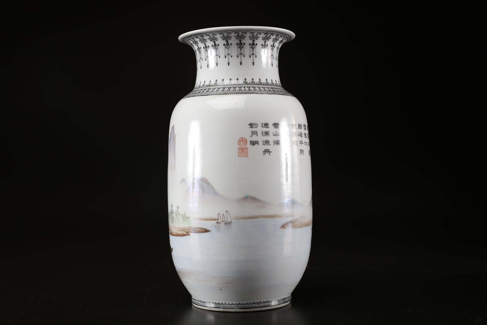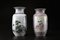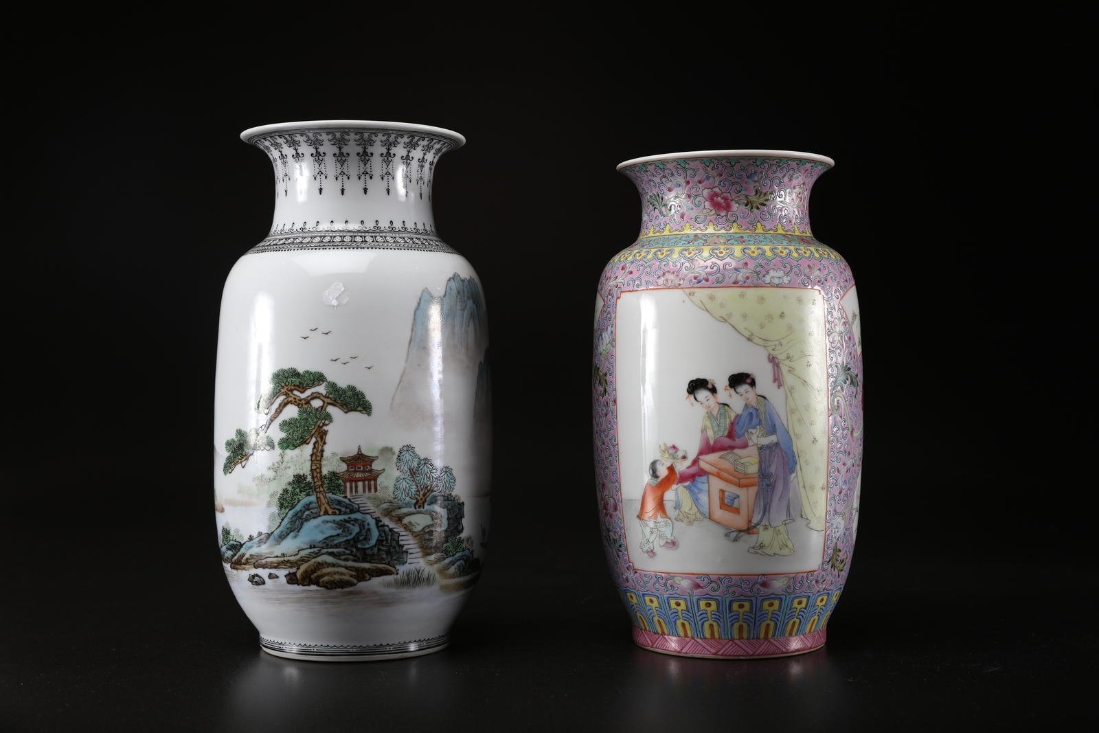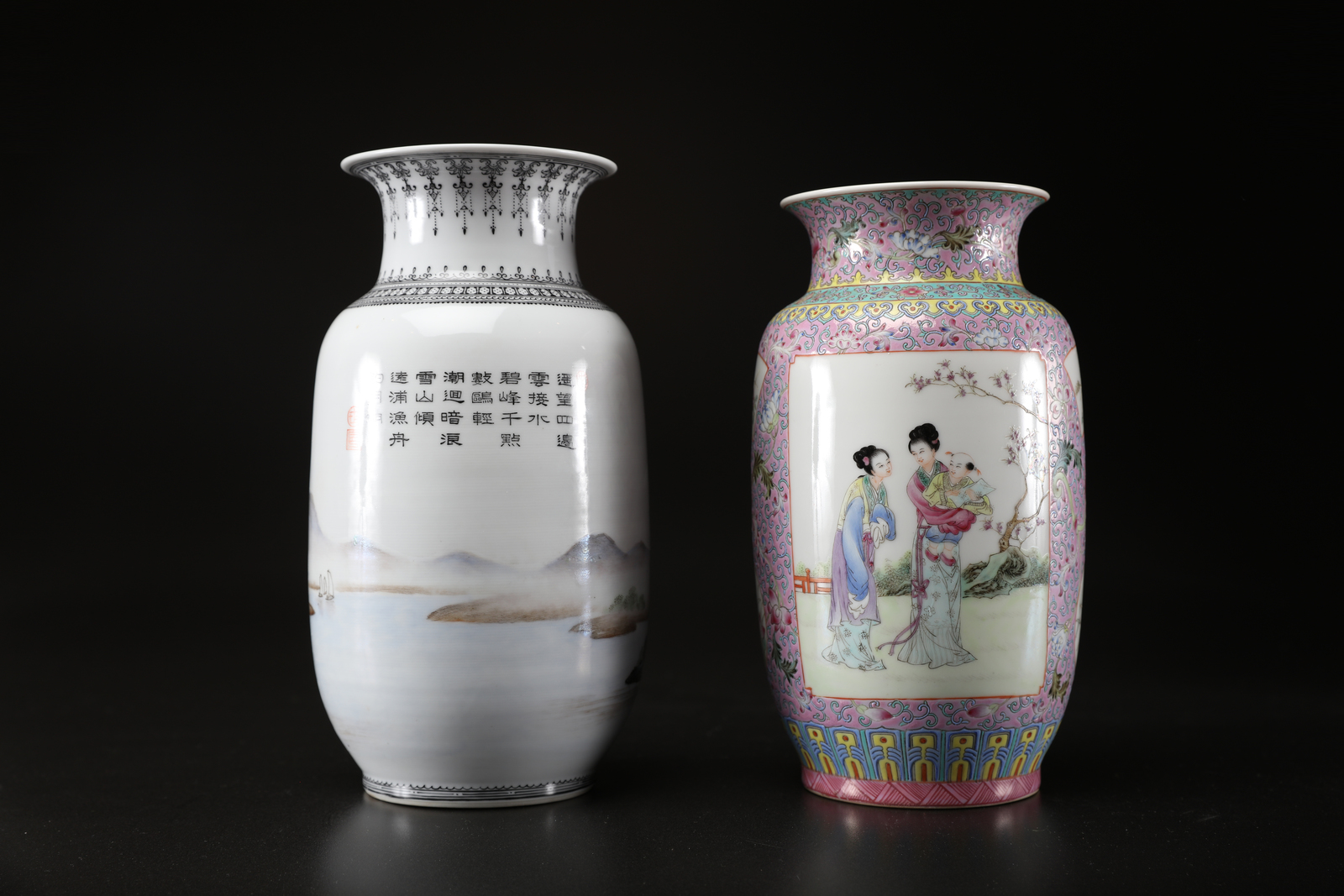 Arte Cinese Due vasi in porcellana policroma, l'uno decorato con dame ed un bambino entro riserve e l'altro con un paesaggio lacustre e lunga iscrizione con marchio e sigillo al retro