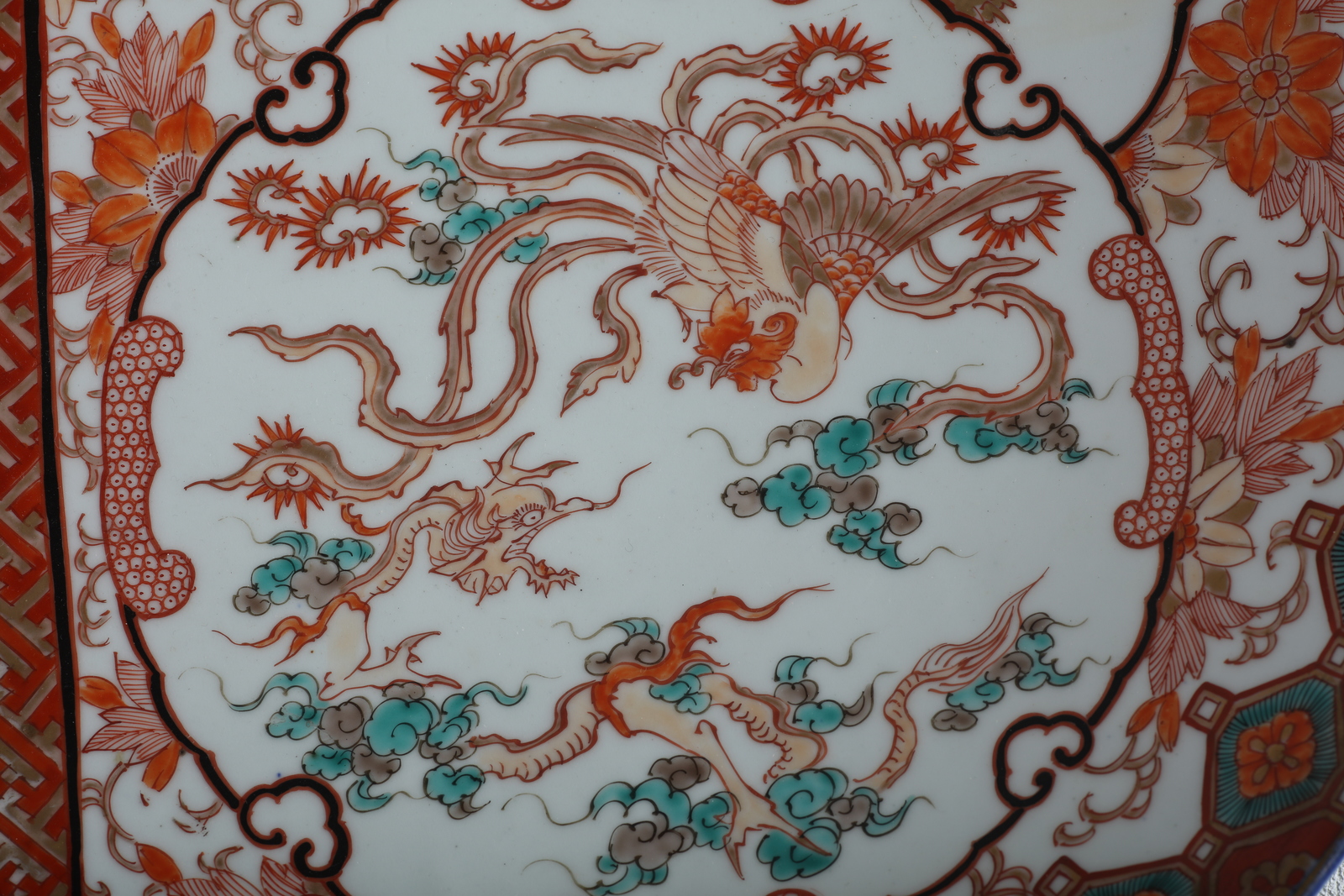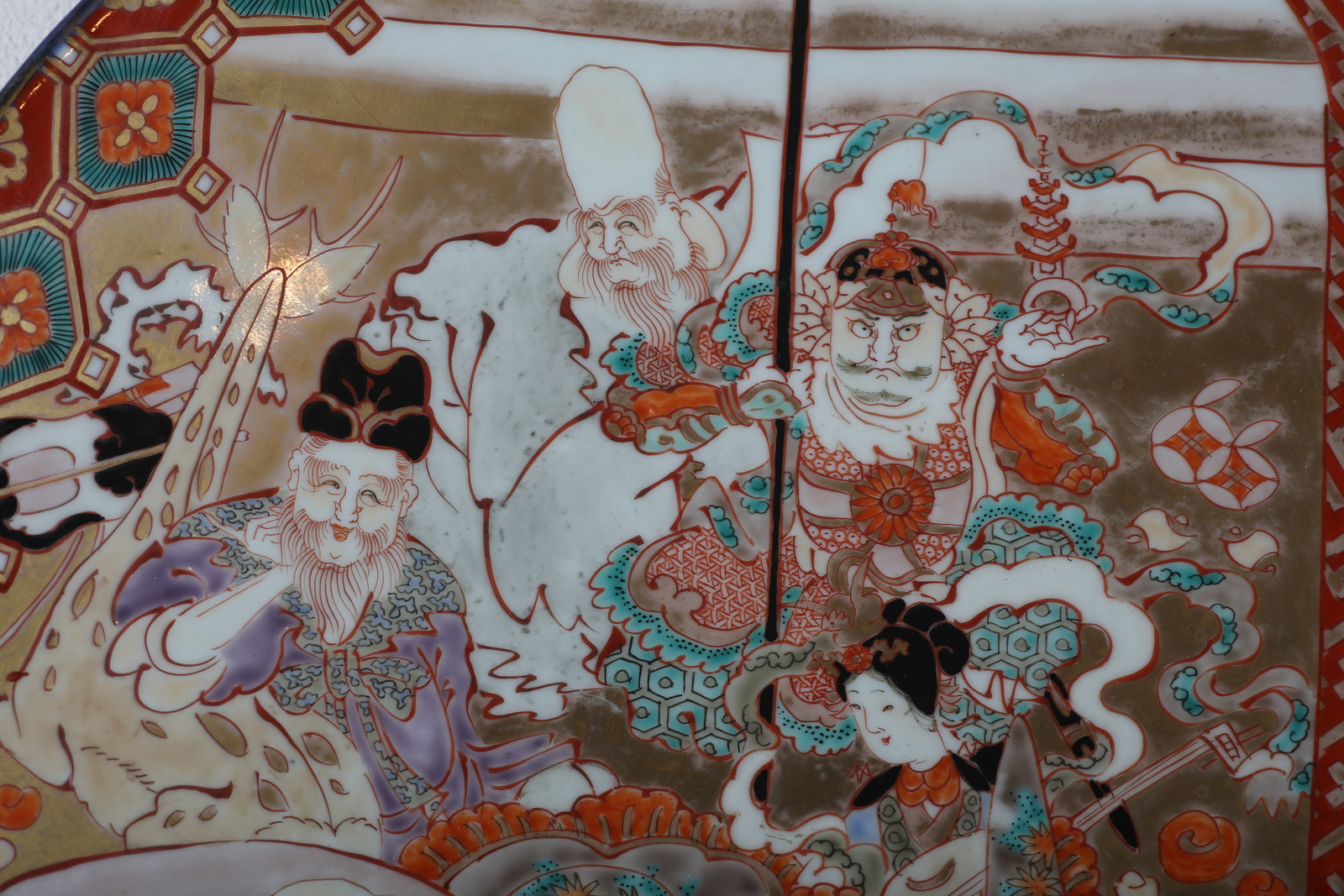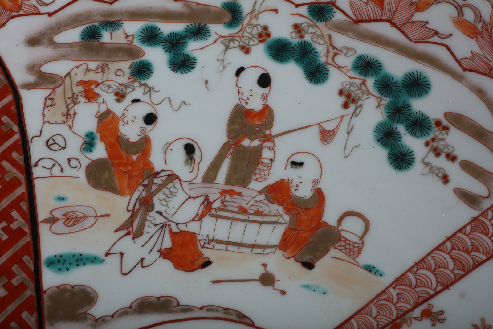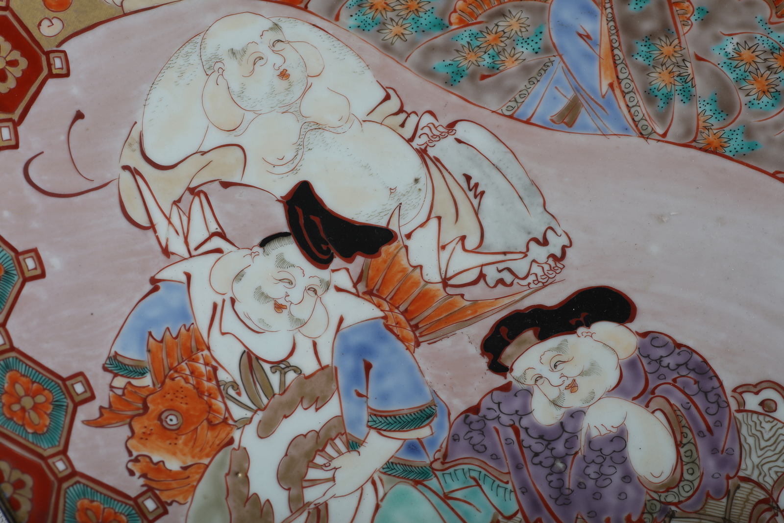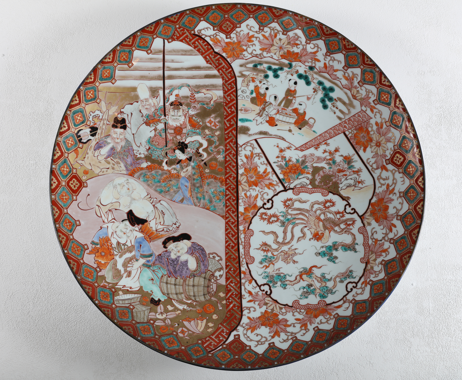 Arte Giapponese A very large Kutani pottery dish enamelled and gilted with ladies, children, phoenix and Budai