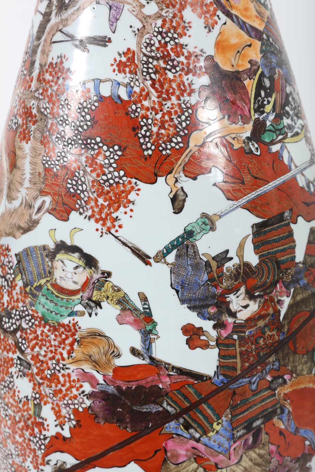 Giappone, XIX secolo. . Cm 32,00 x 110,00 x 38,00. Grande vaso a tulipano con corpo a pera e collo svasato terminante con orlo ondulato. Il corpo è profusamente dipinto con samurai in combattimento, mentre il collo mostra un naturalistico motivo floreale.