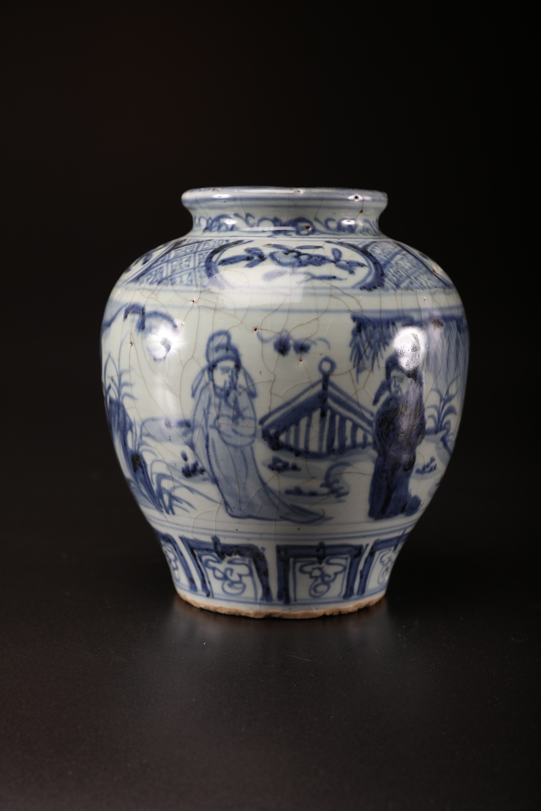 Arte Cinese Vaso in ceramica bianco/blu decorato con personaggi in esterno e motivi vegetali nelle due bande marginali Cina, dinastia Qing. . Cm 18,00. Crettature nella vetrina e difetti di cottura