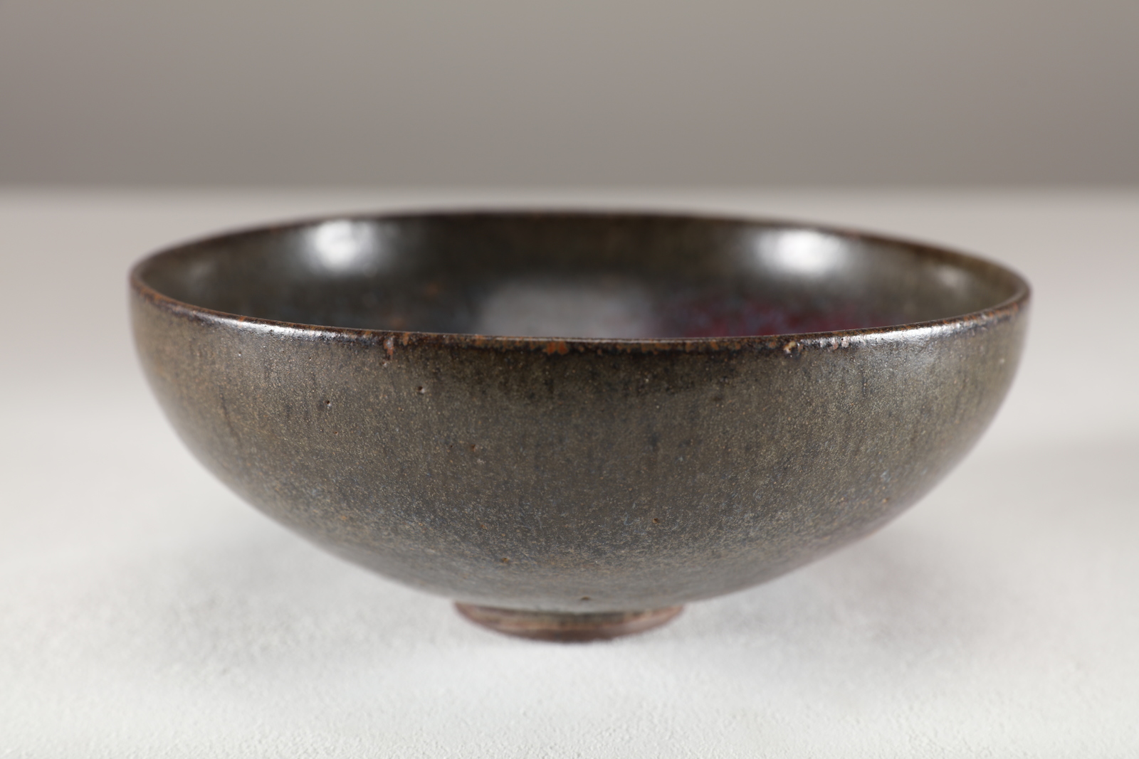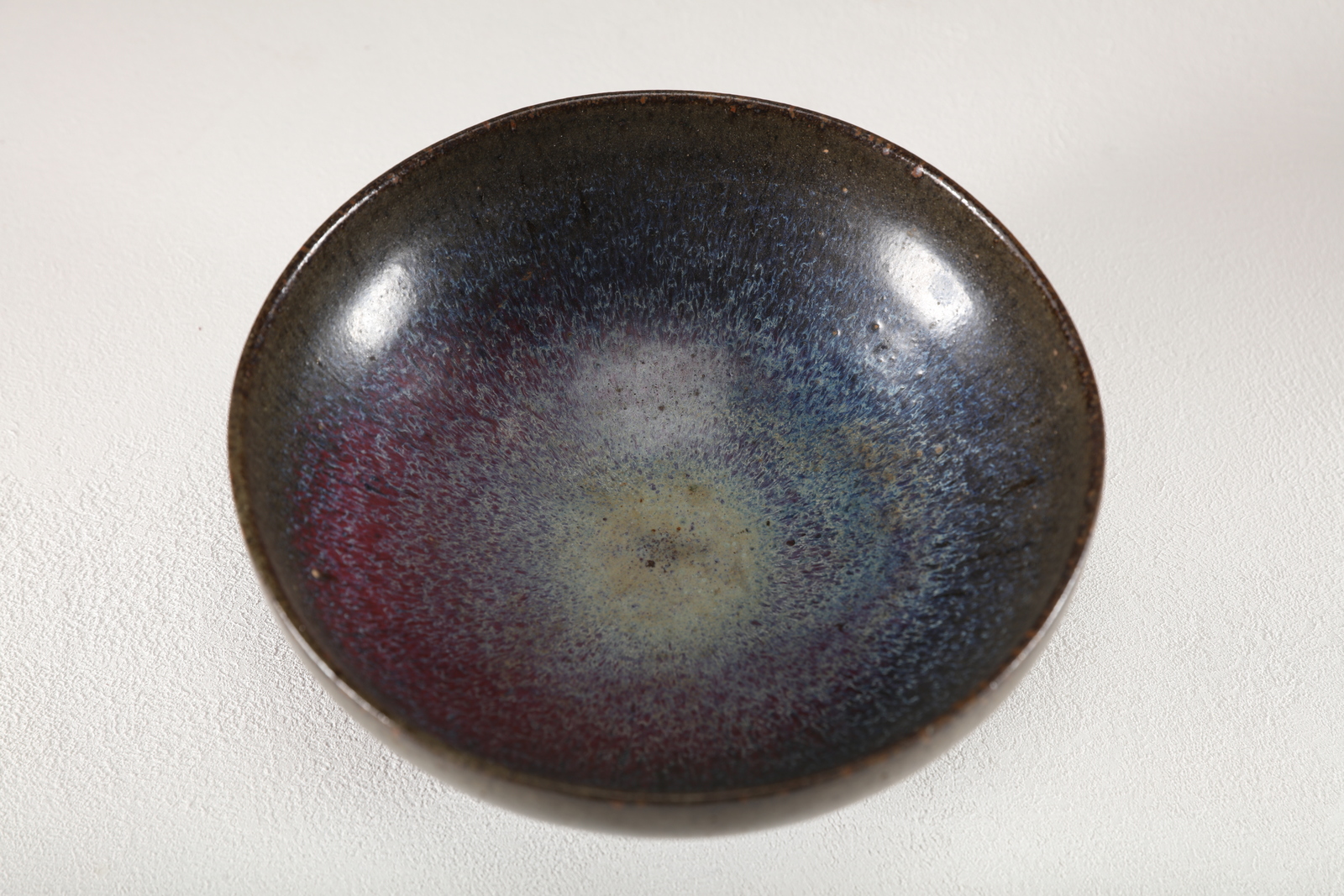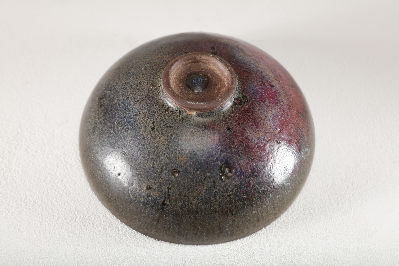 Arte Cinese A Song pottery bowl with radial red and lavander colored thick glaze