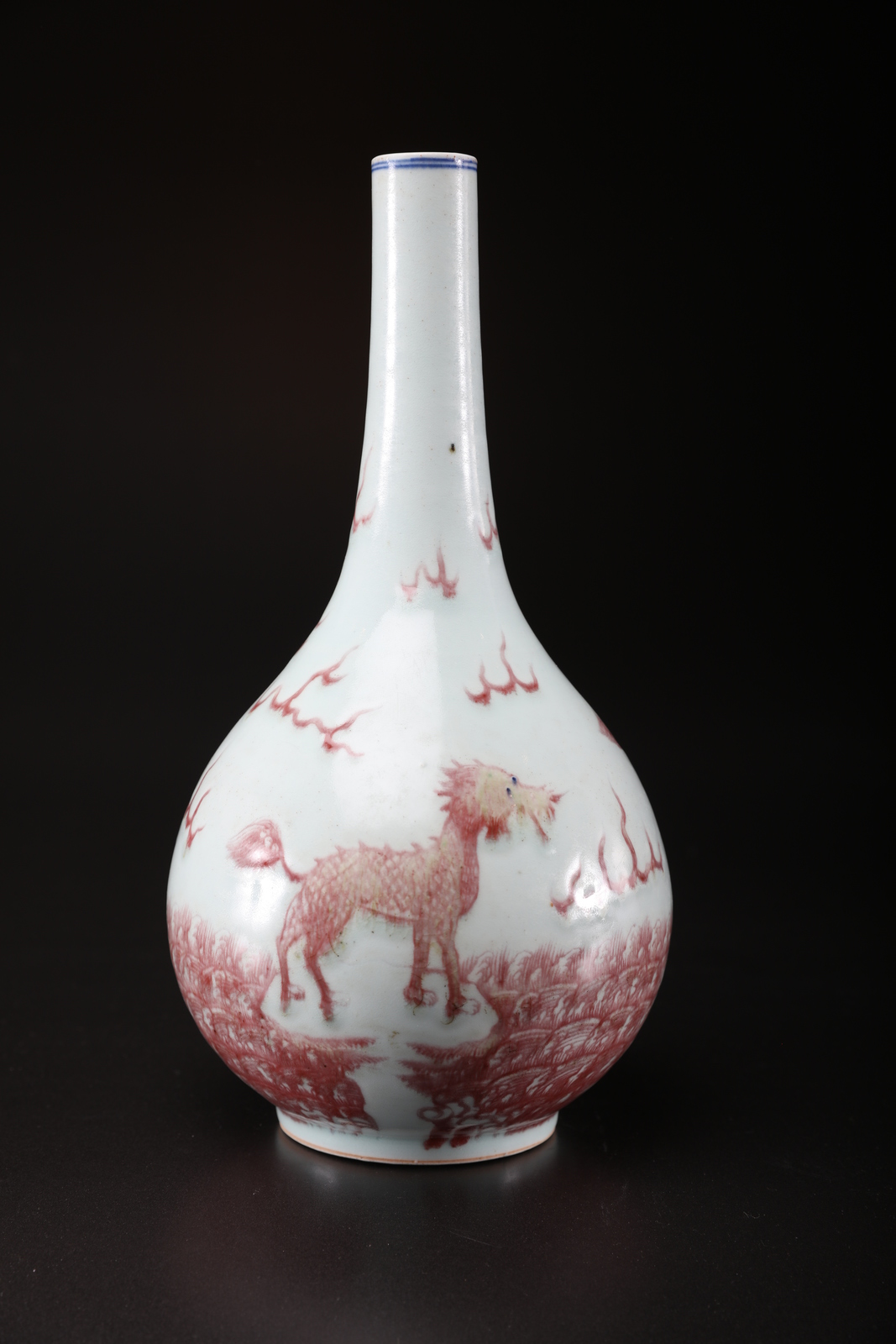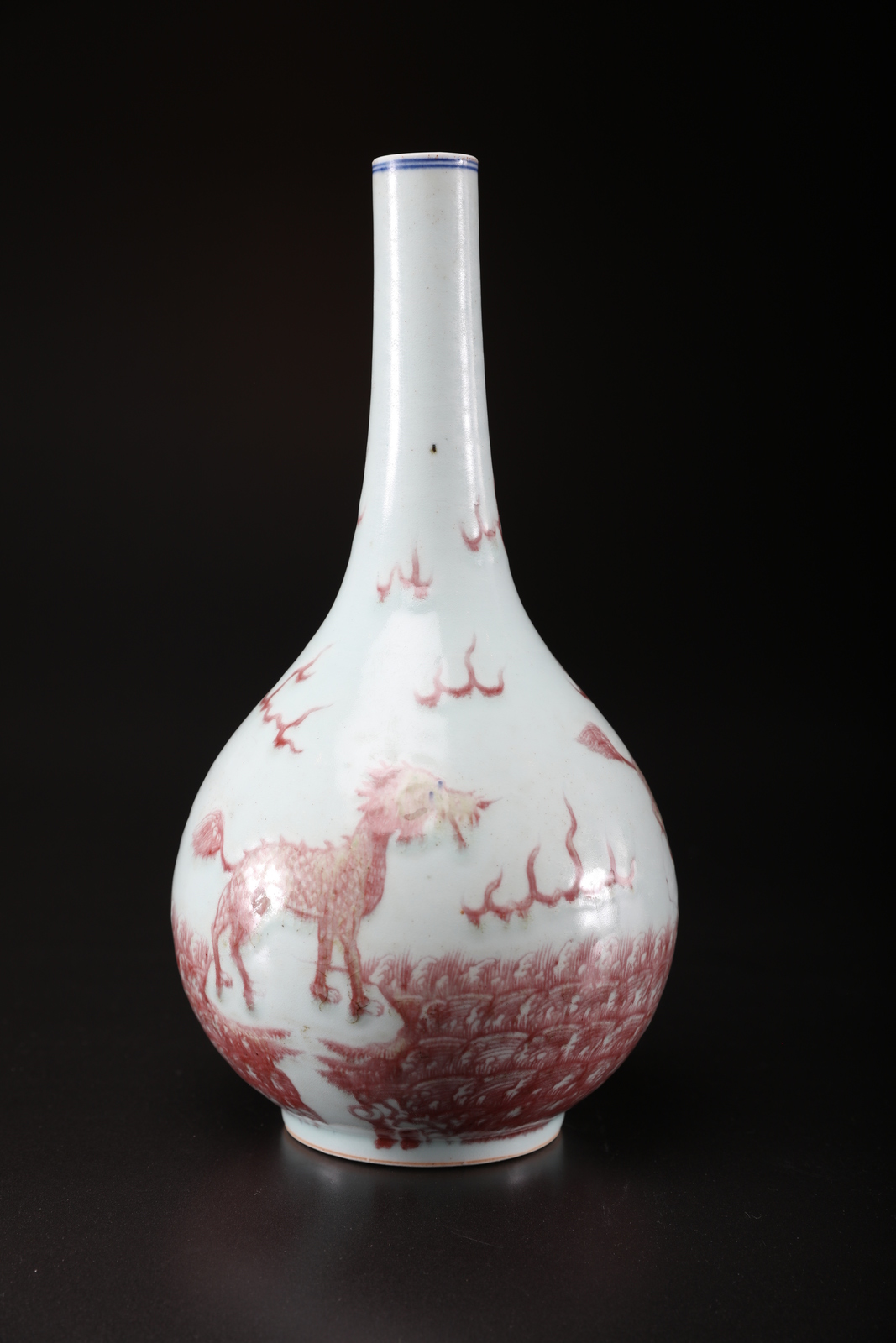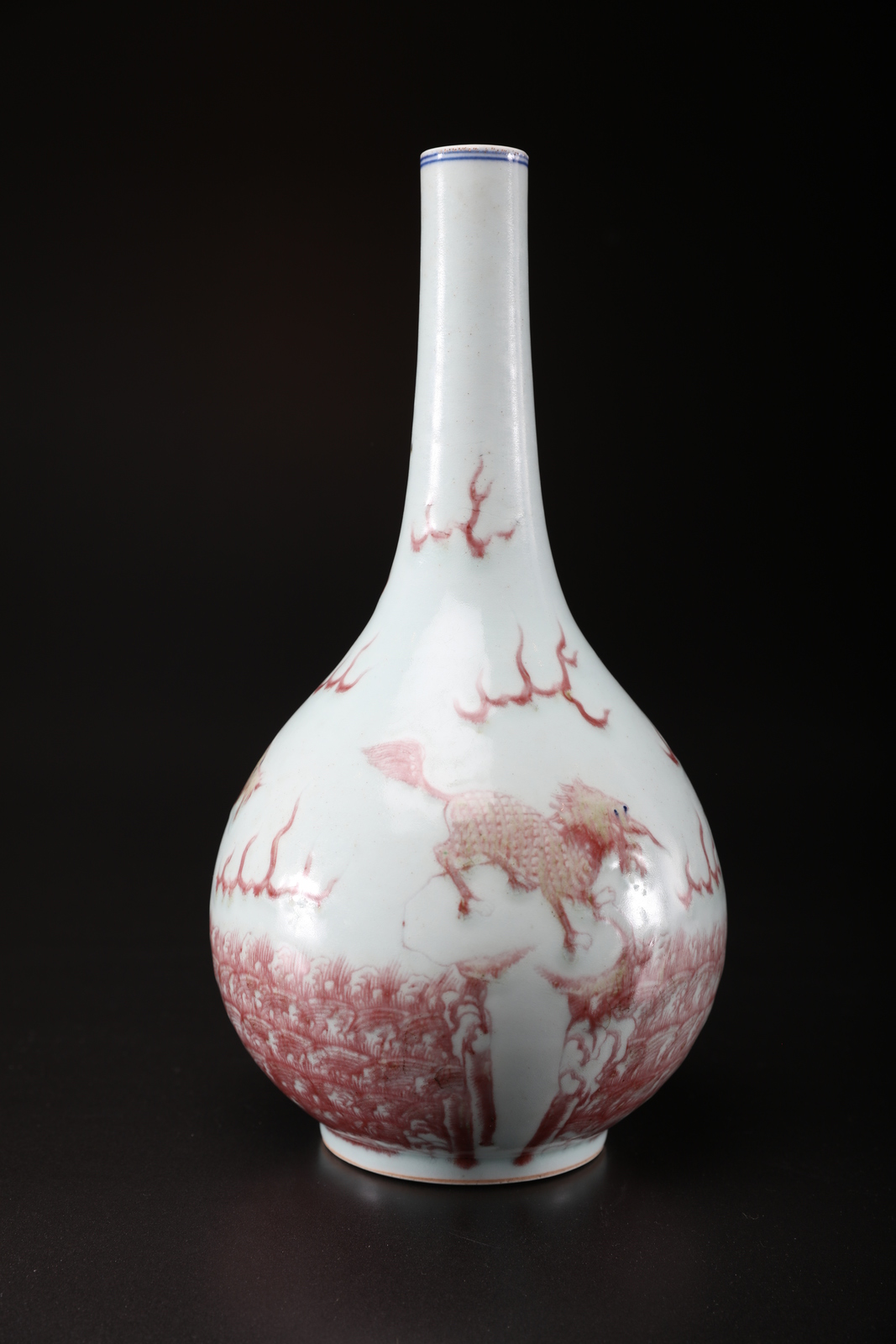 Arte Cinese A tall copper red decorated porcelain bottle vase depicting qilins in water and bearing a six characters Kangxi mark within double circle at the base. China, 19th century . . Cm 34,40.
