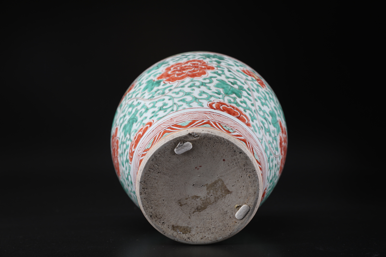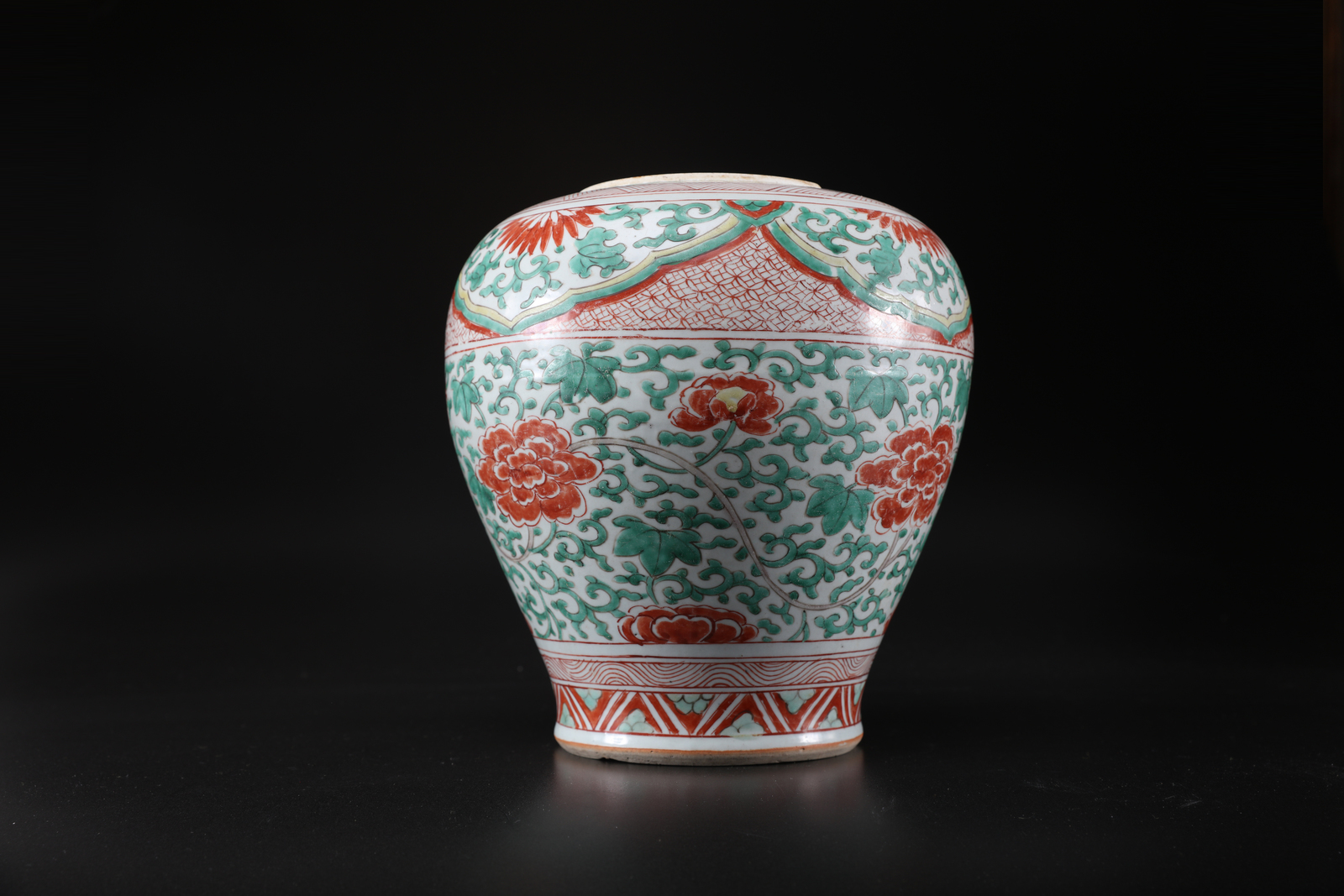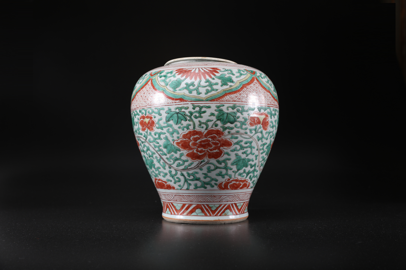 Arte Cinese Vaso wucai in porcellana dipinta con fiori rossi, foglie e tralci...